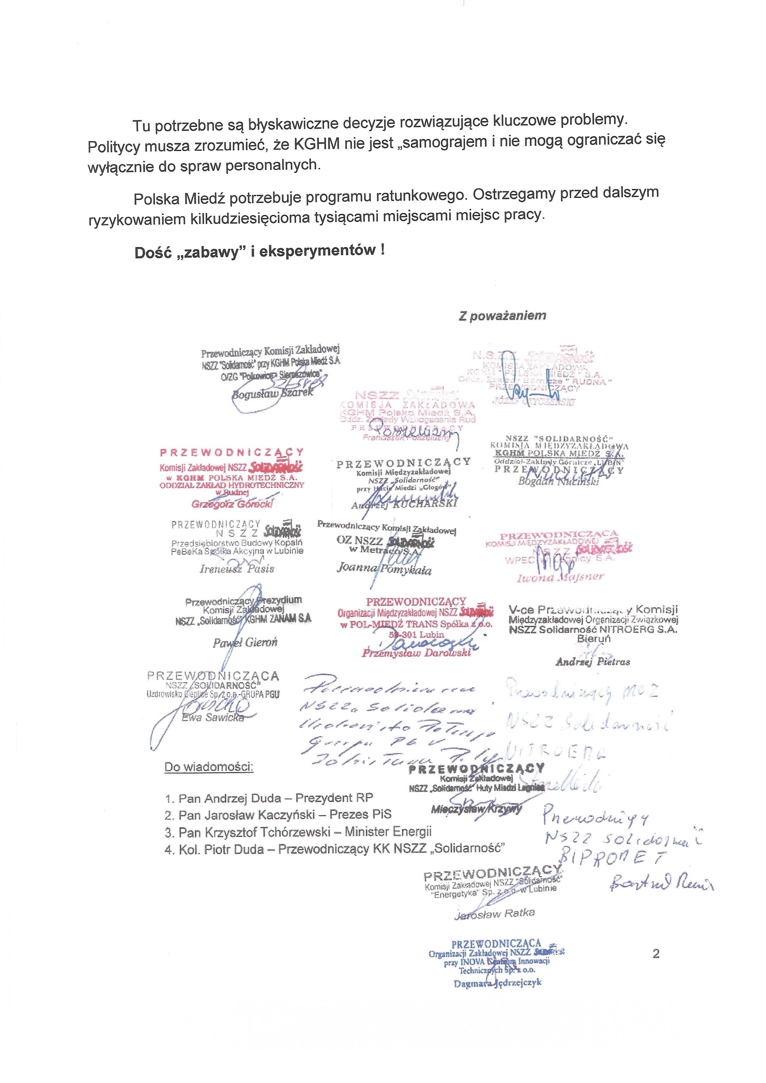 – Ta sytuacja powoduje fundamentalne zagrożenie dla funkcjonowania przemysłu miedziowego i zakończy się tragicznie dla naszych miejsc pracy – biją na alarm związkowcy. – Dość już eksperymentów z Polską Miedzią i igraniem naszymi miejscami pracy. Tu potrzebne są błyskawiczne decyzje rozwiązujące kluczowe problemy. Politycy muszą zrozumieć, że KGHM nie jest „samograjem” i nie mogą ograniczać się wyłącznie do spraw personalnych. Polska Miedź potrzebuje programu ratunkowego. Ostrzegamy przed dalszym ryzykowaniem kilkudziesięcioma tysiącami miejscami miejsc pracy. Dość zabawy i eksperymentów – kończą petycję członkowie miedziowej Solidarności.