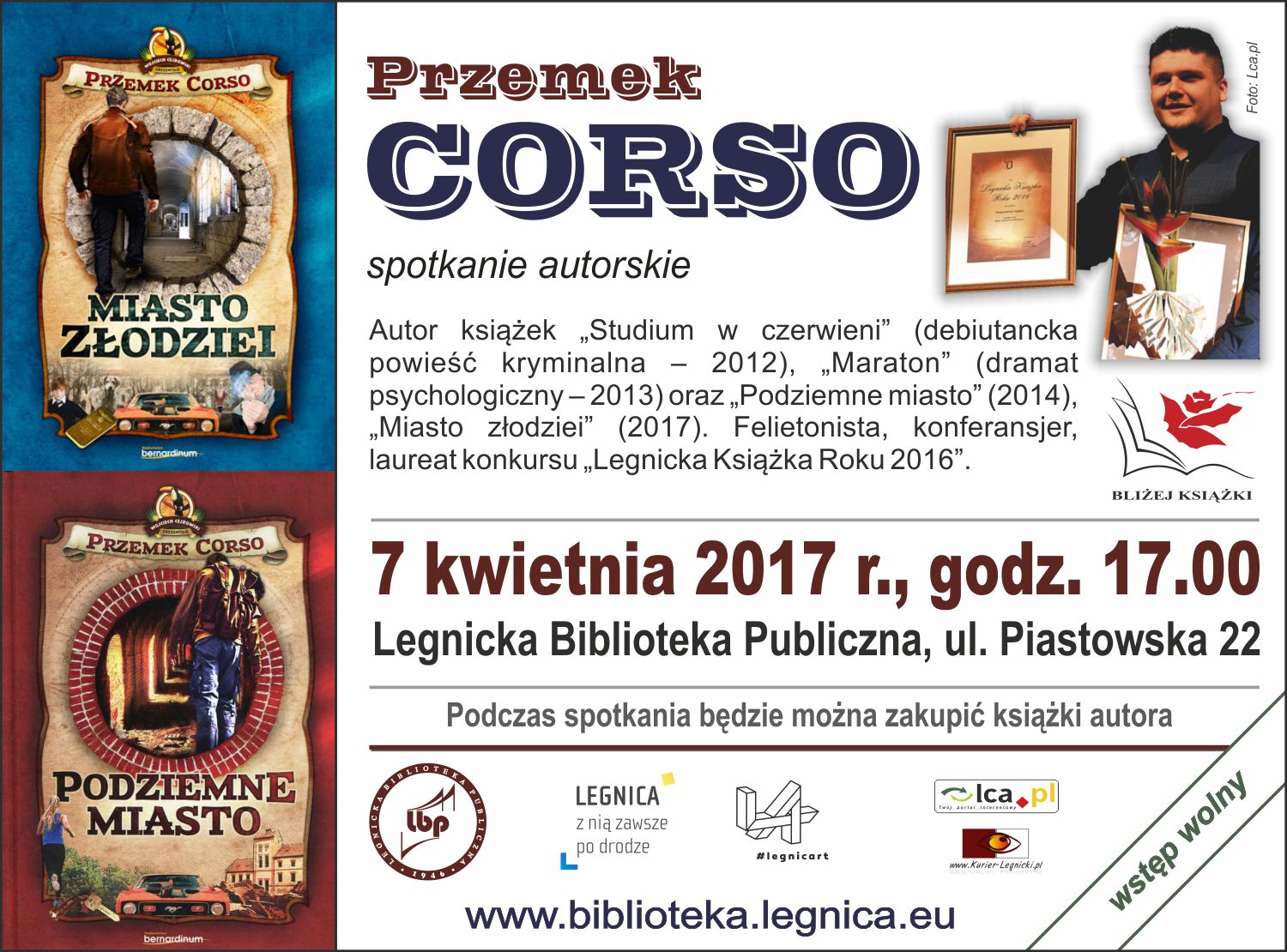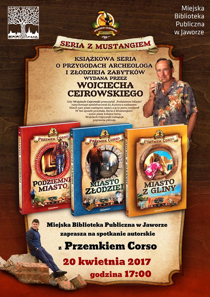 Na spotkania autorskie z Przemkiem Corso – legniczaninem, autorem serii książek przygodowych – zapraszają Legnicka Biblioteka Publiczna w Legnicy oraz Miejska Biblioteka Publiczna w Jaworze. Pisarz, którego talent dostrzegł m.in. Wojciech Cejrowski, jest laureatem Legnickiej Książki Roku 2016 za powieść „Podziemne miasto”.