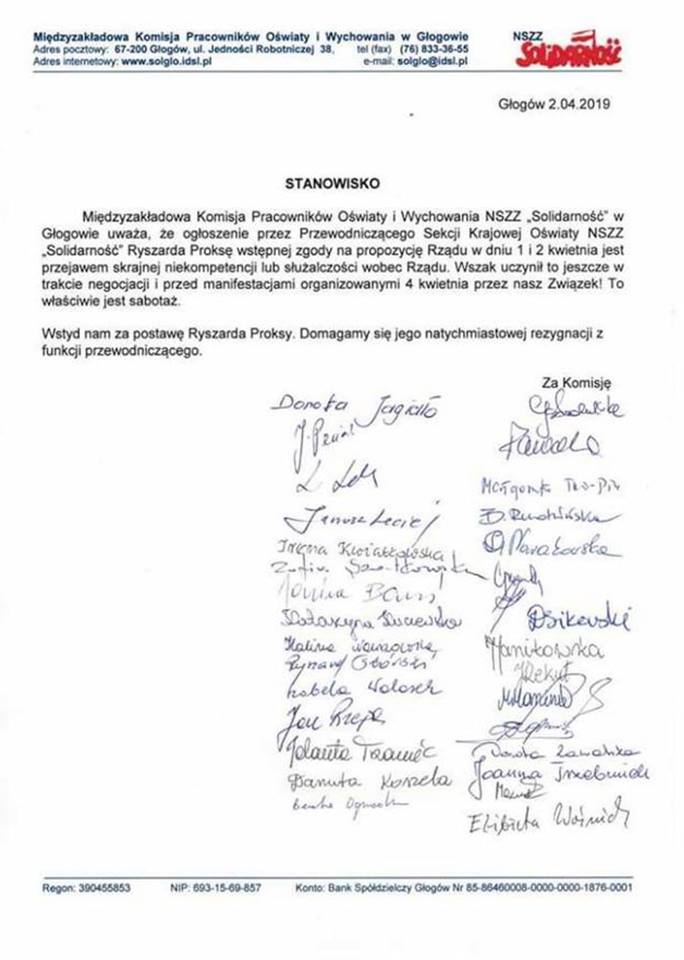Tymczasem wielu nauczycieli należących do związku zawodowego NSZZ „Solidarność” nie zgadza się z działaniami swoich najwyższych przedstawicieli podczas rozmów z rządem. – Wstyd nam za postawę Ryszarda Proksy. Domagamy się jego natychmiastowej rezygnacji ze stanowiska z funkcji przewodniczącego – napisali w oficjalnym stanowisku członkowie Międzyzakładowej Komisji Pracowników Oświaty i Wychowania NSZZ z Głogowa.