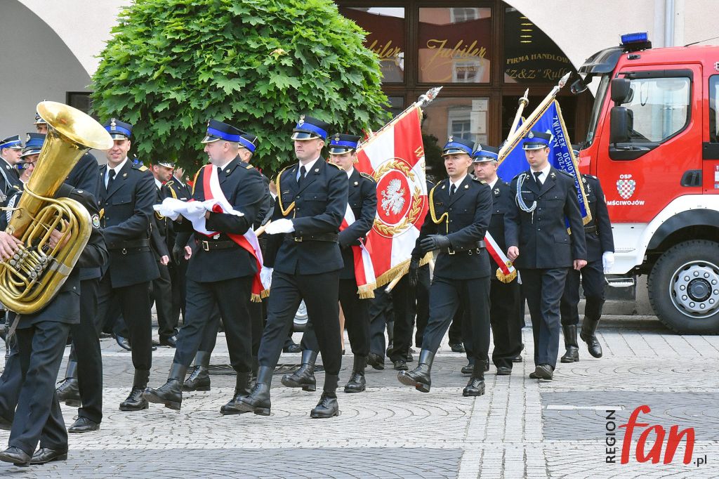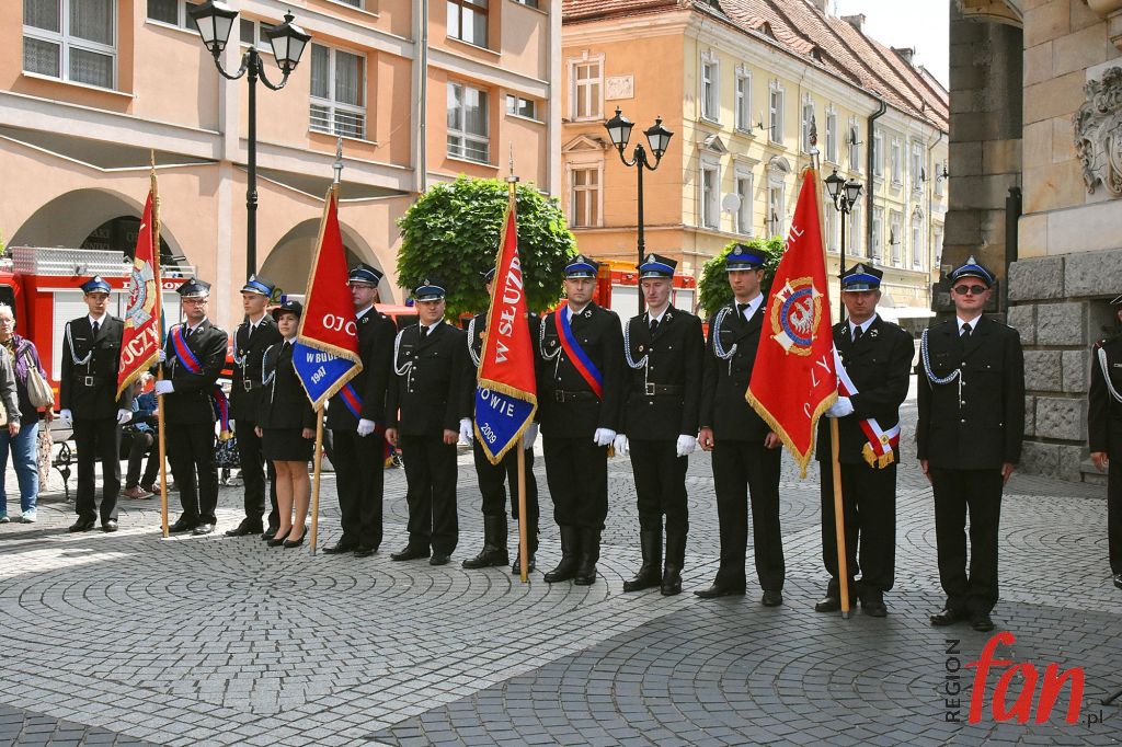 Po nabożeństwie mundurowy pochód ze sztandarami przeszedł do rynku, gdzie odbył się uroczysty apel. Mieszkańców i zaproszonych gości powitał komendant powiatowy PSP w Jaworze, mł. bryg. Waldemar Sarlej. Na trybunie honorowej widzieliśmy poseł Elżbietę Witek, st. bryg. Adama Koniecznego, Dolnośląskiego Wojewódzkiego komendanta PSP i dha Bogdana Wilczaka, członka zarządu Oddziału Wojewódzkiego OSP oraz delegacje straży z sąsiednich powiatów: Legnicy, Środy Śląskiej, Złotoryi i Świdnicy.