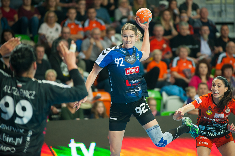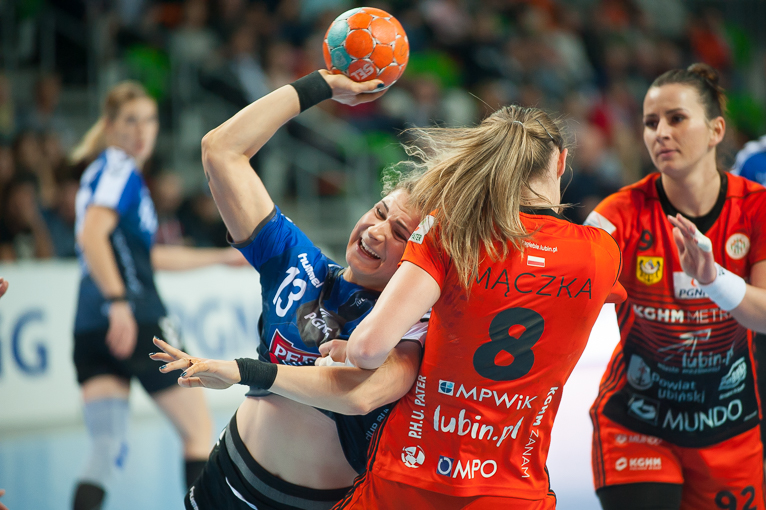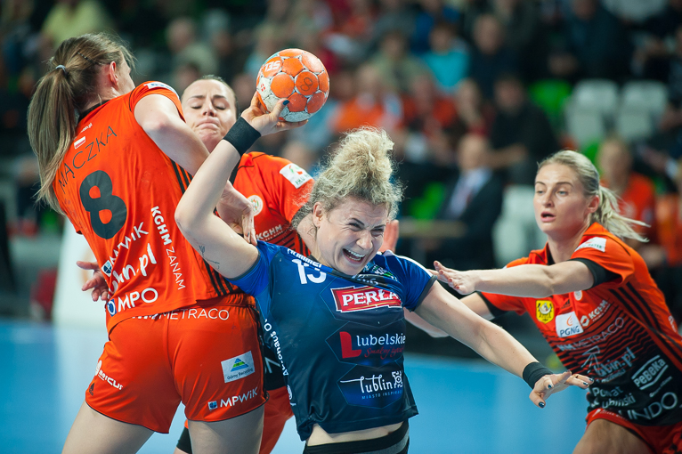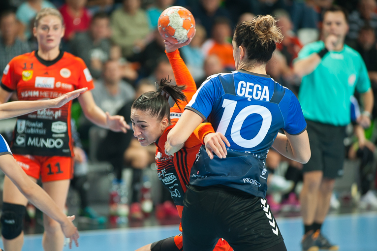Przyjezdne lepiej weszły w mecz i po niespełna pięciu minutach prowadziły 3:0. Na pierwszą bramkę kibice Miedziowych czekali do szóstej minuty. Wówczas po składnej akcji bramkę z koła zdobyła Jovana Milojević. Zespół z Lubelszczyzny wyszedł na 5:2, ale później zaczął się koncert Metraco Zagłębia. Znakomite interwencje Moniki Maliczkiewicz, kolejne bramki Kingi Grzyb, w tym jedna z drugiej linii dała Miedziowym prowadzenie 6:5! Chwilę później podopieczne Bożeny Karkut i Renaty Jakubowskiej prowadziły dwoma bramkami – 8:6. Lubinianki nie zwalniały tempa i grały swoją piłkę ręczną. Dopiero pod koniec pierwszej połowy zawodniczki Perły doprowadziły do remisu, co zapowiadały kolejne emocje w drugiej połowie.