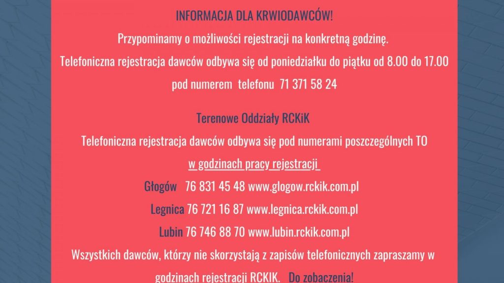 W ostatnim czasie w wielu centrach krwiodawczych w Polsce znacznie spadły stany krwi, co ma oczywisty związek z epidemią koronawirusa. Nie inaczej jest we wrocławskiej placówce i podległych jej oddziałach terenowych, w tym też w Lubinie. Najbardziej potrzebne są grupy: O Rh-, O Rh+, A Rh-, A Rh+, B Rh-.