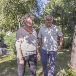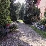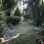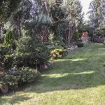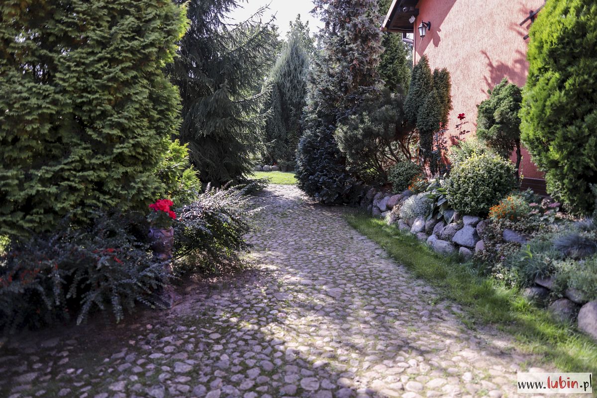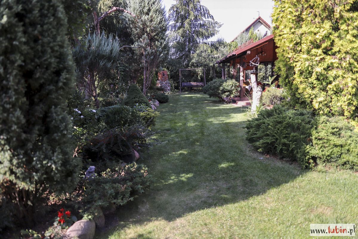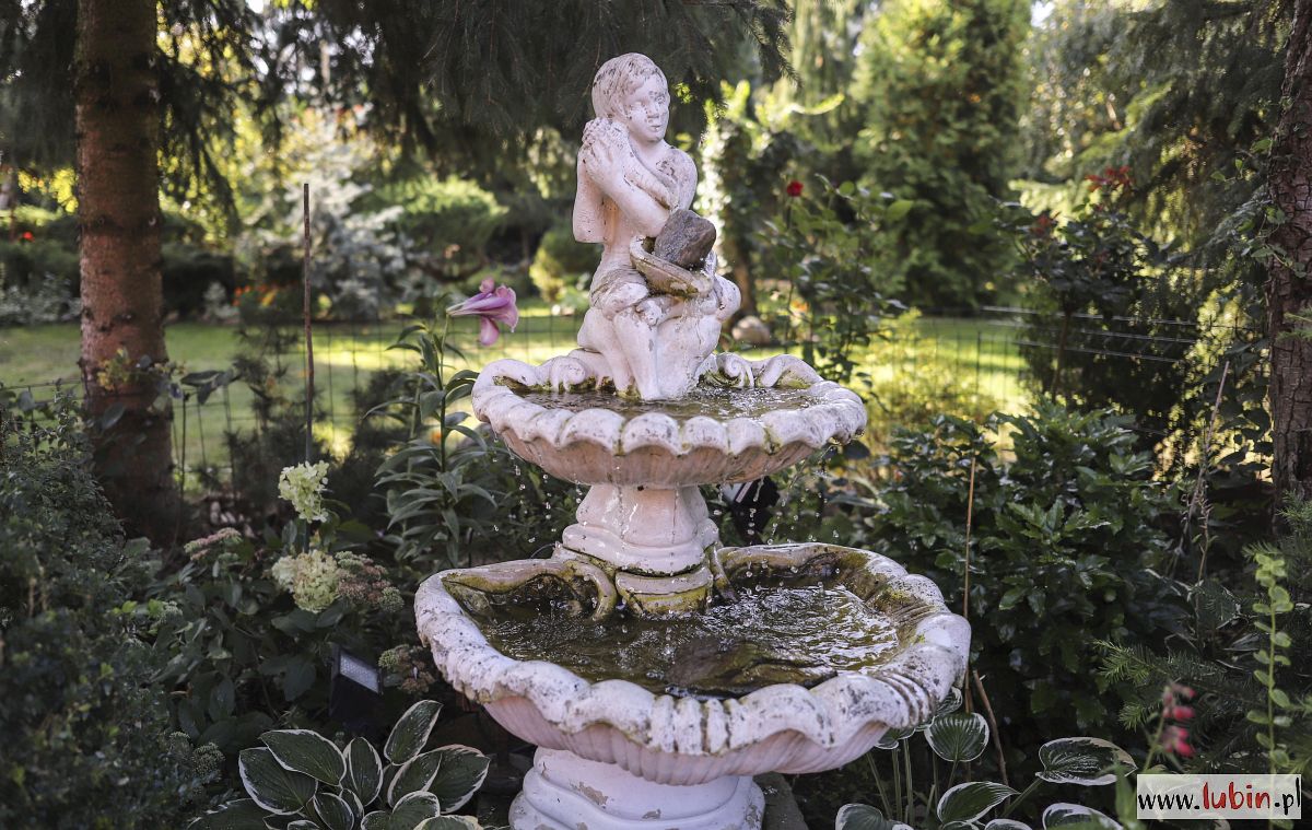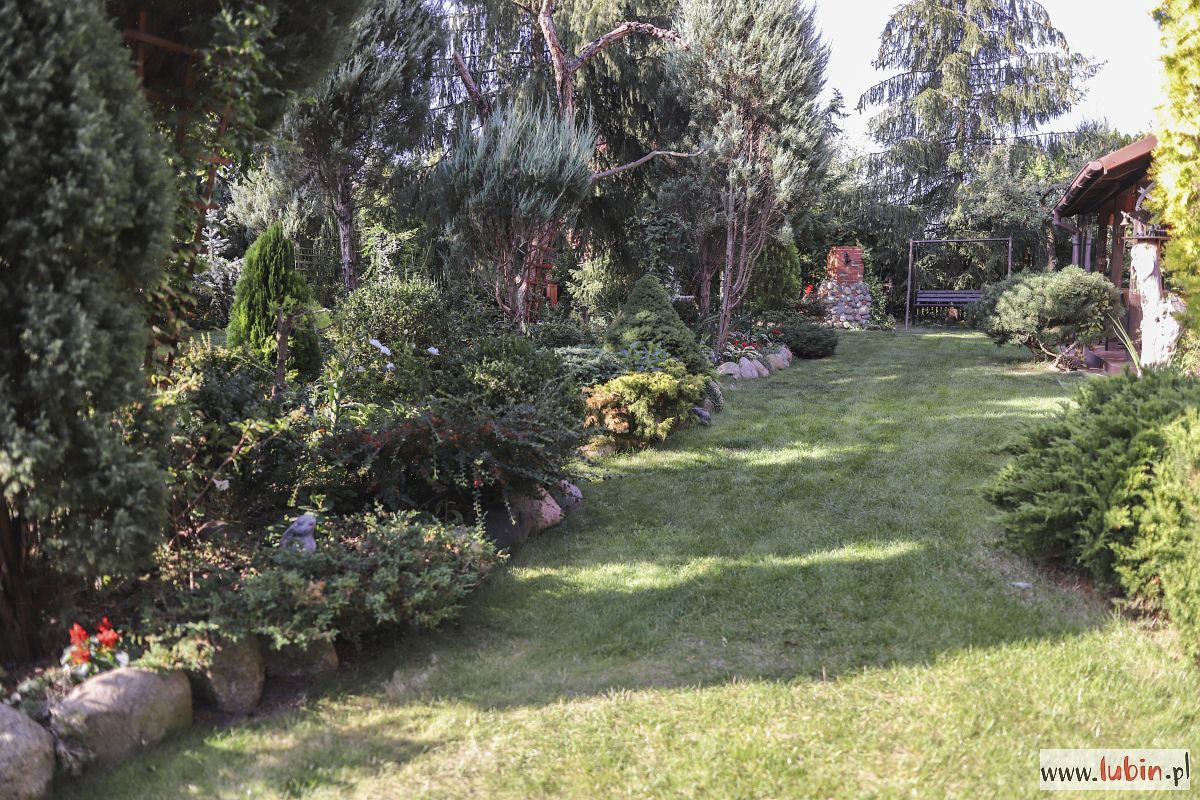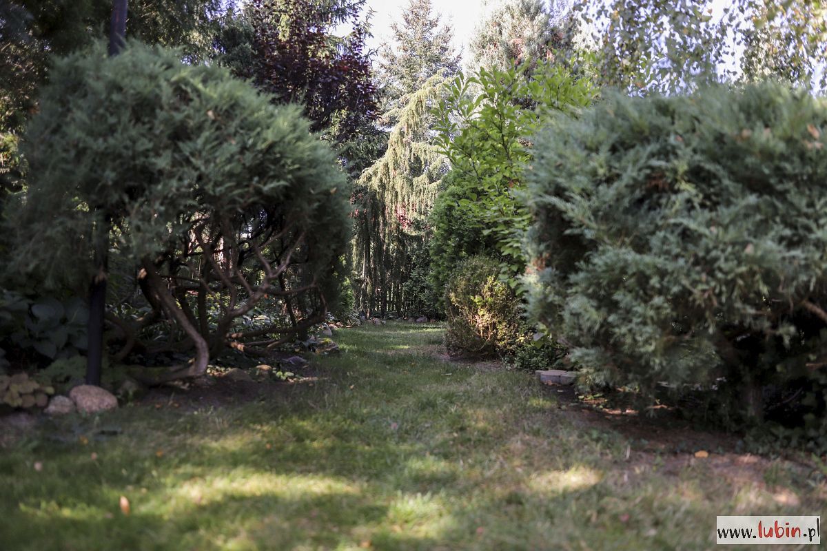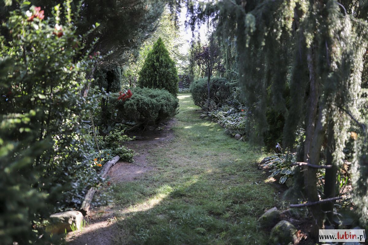 Wyłożoną kamieniami ścieżką między zielonymi drzewami, które nie od razu odkrywają tajemnice tego miejsca, wchodzimy do niezwykłej przestrzeni. Sami właściciele, pani Alicja i pan Zbigniew, mają problem, by zliczyć gatunki roślin, które można tu znaleźć. Lipa, czereśnie, sosny, daglezje, róże, hortensje, jałowce, cyprysy, m.in. nutkajski – to dopiero początek. Na i przy kompostowniku rozłożyła się dynia, między drzewami szumi woda i ćwierkają ptaki. Ale nie zawsze tak było – pani Alicja śmieje się, że swego czasu sadziła cebulę do góry nogami.