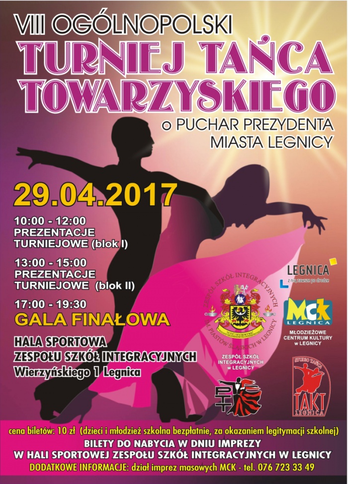 Ponad sto par wystąpi podczas VIII Ogólnopolskiego Turniej Tańca Towarzyskiego o Puchar Prezydenta Legnicy, który odbędzie się w sobotę, 29 kwietnia br., w hali Zespołu Szkół Integracyjnych przy ul. Wierzyńskiego 1 w Legnicy.