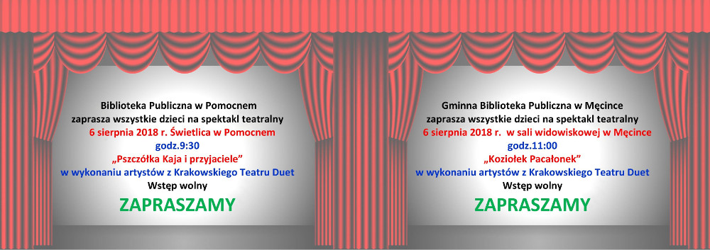 Młodzi widzowie, którzy odwiedzą dziś świetlicę wiejską w Pomocnem obejrzą spektakl pt. „Pszczółka Kaja i przyjaciele”. Występ artystów z Krakowa rozpocznie się o godz. 9.30. Natomiast o godz. 11.00 aktorzy pojawią się w Męcince, gdzie w sali widowiskowej miejscowej biblioteki publiczna zagrają spektakl pt. „Koziołek Pacanołek”.