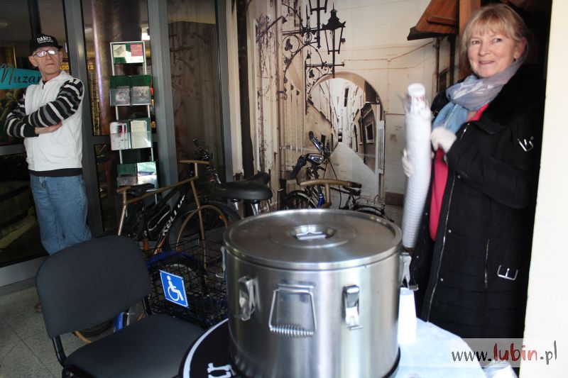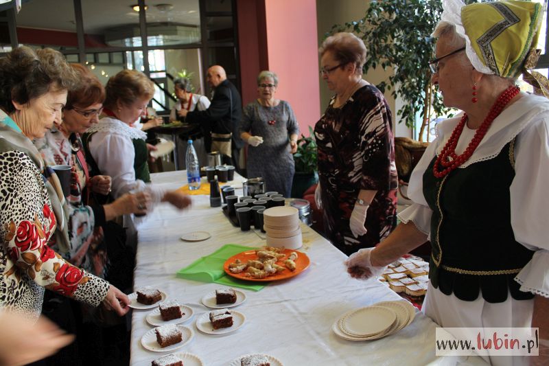 Ludzie mierzą, kupują, inni tylko oglądają. Tuż obok lubińscy seniorzy częstują sernikiem, rogalikami i piernikiem. Do tego jest kawa i herbata. Smakołyki znikają w mgnieniu oka.