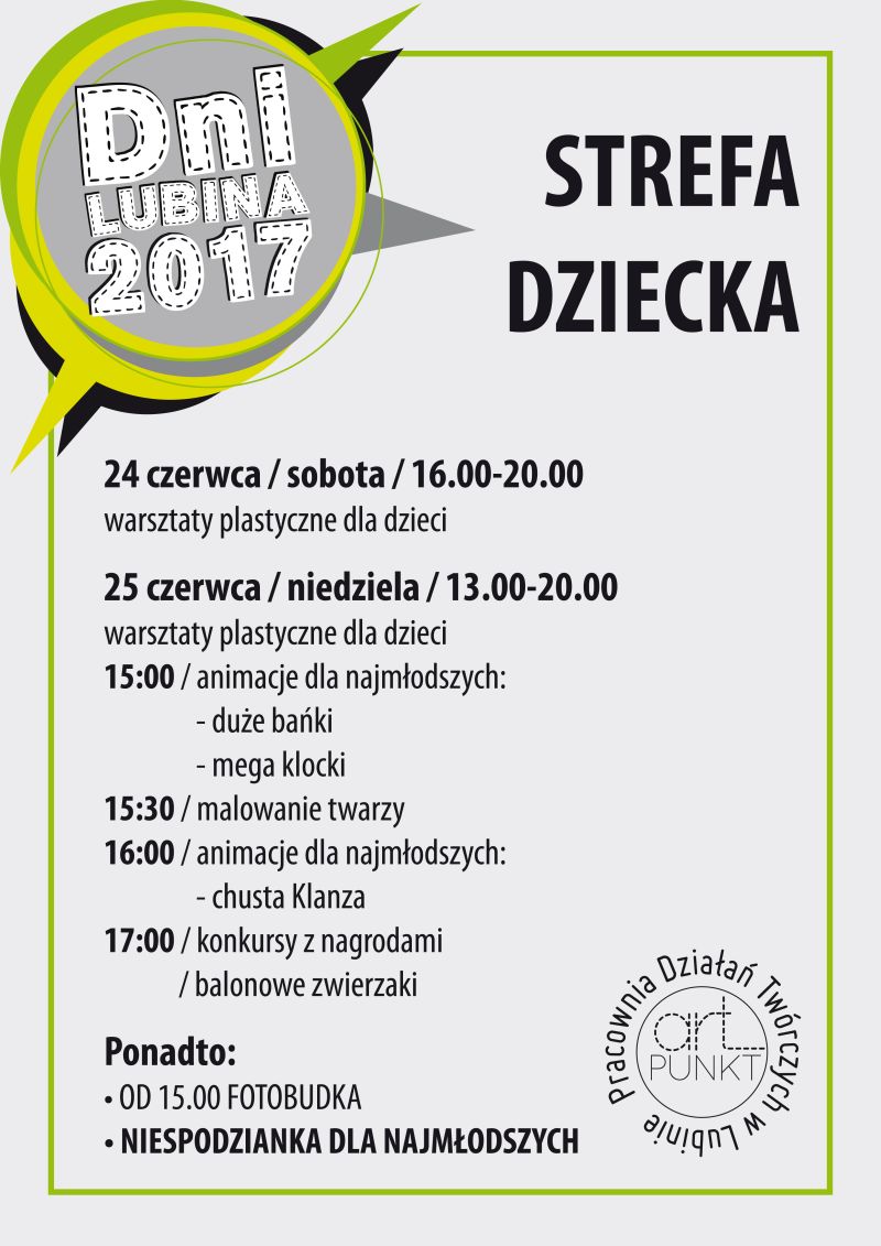 Jak zwykle nie zabraknie także miejsca dla najmłodszych, czyli Strefy Dziecka. To miejsce zabaw i zdobywania umiejętności plastycznych, a także poszerzania wiedzy na temat naszego miasta. Blok warsztatów twórczych bowiem poświęcony będzie tematyce związanej z historią oraz zabytkami Lubina.