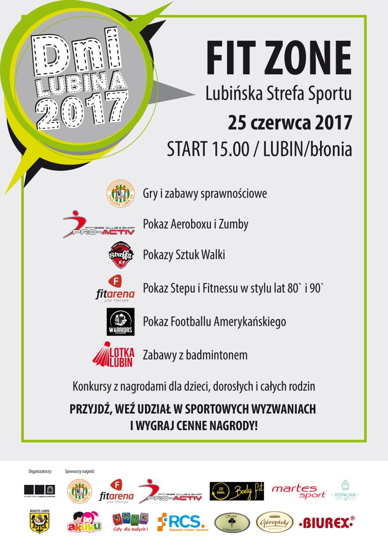 Dni Lubina to nie tylko muzyka. W tym roku będzie także okazja, by zadbać o kondycję i zdobyć niezbędne informacje na temat diety czy tego, jak zdrowo i bezpiecznie uprawiać sport, jak żyć aktywnie. W niedzielę od godziny 15 na błoniach będzie działać Lubińska Strefa Sportu Fit Zone. Każdy znajdzie tam coś dla siebie. W programie strefy są: gry, zabawy, konkursy i pokazy różnych form aktywności fizycznej takich, jak zumba, aeroboks czy futbol amerykański. W Strefie Fit Zone można będzie także uzyskać porady od trenerów czy dietetyków na temat programów treningowych, konkretnych ćwiczeń jak również prawidłowego odżywiania.