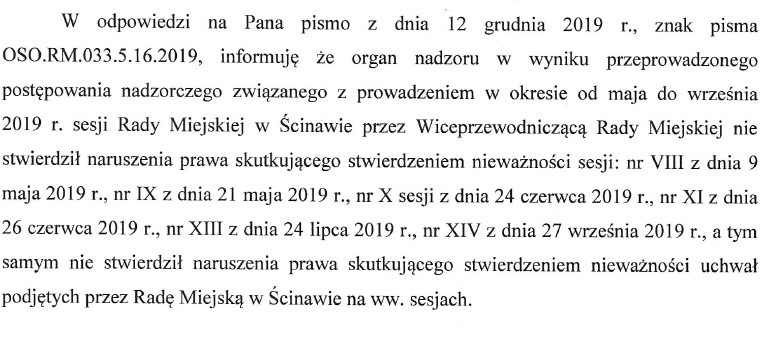 Przedstawiciele „Lepszej Ścinawy” jak zapowiedzieli tak zrobili i wysłali do wojewody dolnośląskiego wniosek o unieważnienie wspomnianych sesji. Odpowiedź, jaka przyszła z Wrocławia, z pewnością nie usatysfakcjonuje wnioskodawców. Okazało się bowiem, że nie mieli racji, a w opinii wojewody wszystko odbyło się zgodnie z prawem. Poniżej publikujemy treść odpowiedzi.