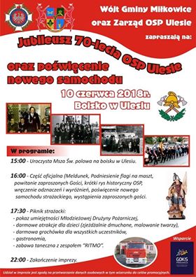 Ochotnicza Straż Pożarna w Ulesiu obchodzi w tym roku 70-lecie swojego istnienia. Z tej okazji zarząd jednostki oraz wójt gminy Miłkowice zapraszają w najbliższą niedzielę na piknik strażacki.