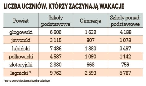 W naszym regionie świadectwa odbierze blisko 60 tys. uczniów, najwięcej w powiecie legnickim (18,1 tys.), zaś najmniej w złotoryjskim (4,2 tys.). Co ciekawe, z powodu reformy szkolnictwa, w tym roku zabraknie absolwentów szkół podstawowych, które, po kilkunastu latach, znów są ośmioletnie. Kosztem wygaszanych gimnazjów o rok dłużej potrwa też edukacja na poziomie szkół ponadpodstawowych, czyli techników, liceów i szkół branżowych.