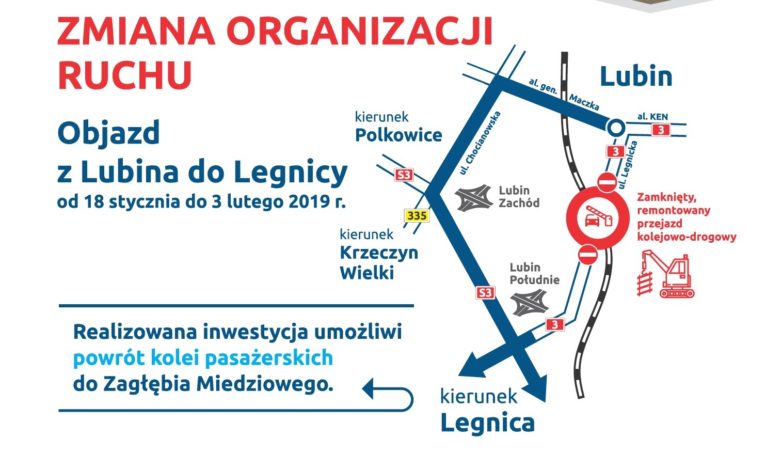 Od 18 stycznia zamknięty będzie przejazd kolejowy na ulicy Legnickiej w Lubinie. Taka sytuacja potrwa dwa tygodnie, a kierowcy będą musieli korzystać z objazdu drogą S3, od strony Krzeczyna Wielkiego.