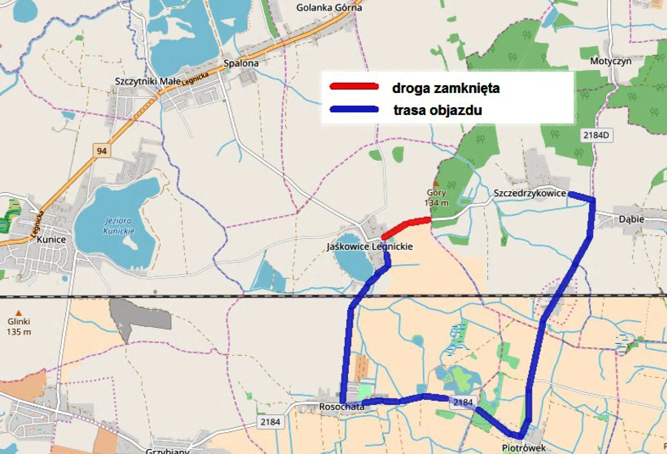 Jak informuje Wydział Komunikacji i Dróg Starostwa Powiatowego w Legnicy, droga powiatowa zamknięta będzie w związku z jej planowanym remontem. Objazd wyznaczony został przez miejscowości Rosochata-Piotrówek, według załączonej mapy.