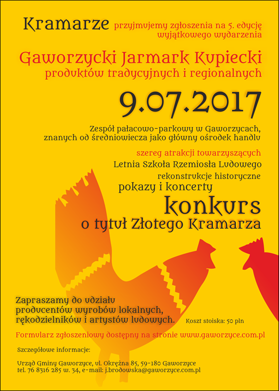 JARMARK1Chociaż piąta – jubileuszowa – edycja Gaworzyckiego Jarmarku Kupieckiego, produktów tradycyjnych i regionalnych odbędzie się dopiero 9 lipca, to organizatorzy już teraz zachęcają regionalnych twórców, m.in.: rzemieślników, rękodzielników, sołectwa oraz artystów ludowych do zgłoszenia udziału w imprezie.