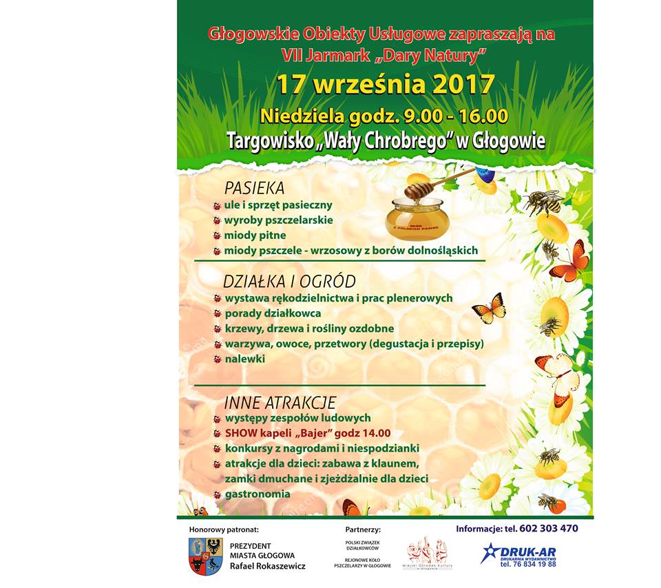 Miody, nalewki, rękodzieła, a także owoce i przetwory można będzie kupić w najbliższą niedzielę podczas VII Jarmarku „Dary Natury” na targowisku przy Wałach Chrobrego w Głogowie. Atrakcją będą występy zespołów ludowych oraz kapeli Bajer.
