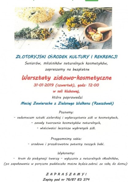 Zajęcia odbędą się w sali widowiskowej Złotoryjskiego Ośrodka Kultury i Rekreacji w najbliższy czwartek o godz. 12. Poprowadzi je Maciej Zawierucha z Zielonego Wulkanu w Rzeszówku, gdzie podobne warsztaty odbywają się na co dzień. Organizatorzy zapraszają przede wszystkim seniorów oraz miłośników naturalnych kosmetyków.