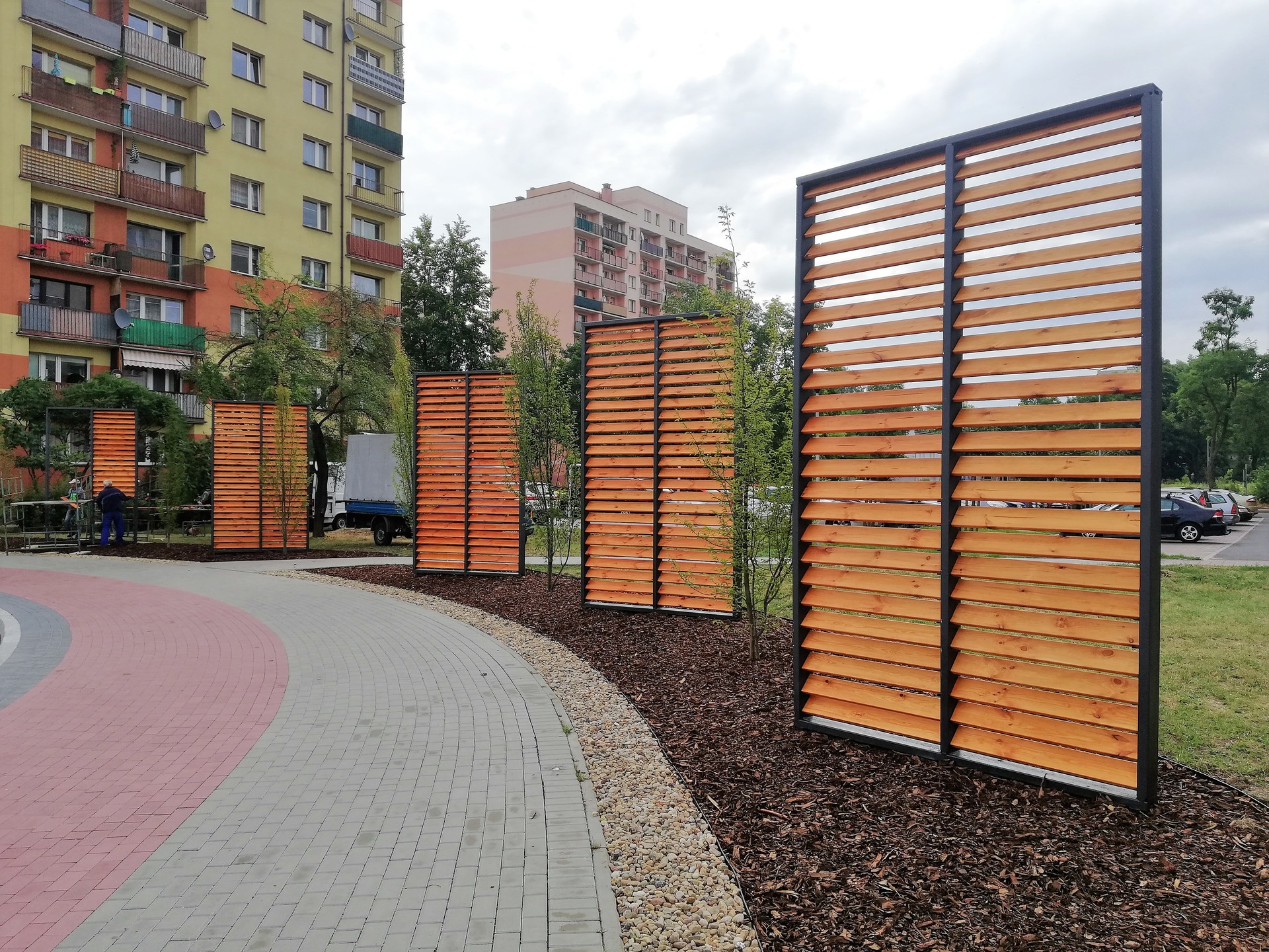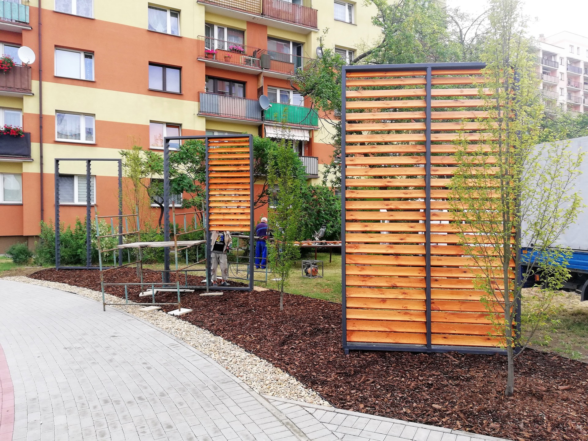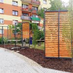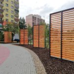 Ekran zaprojektowano w postaci trejaży, przy których będzie posadzona roślinność pnąca, między innymi winorośl japońska.