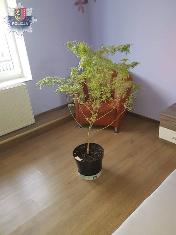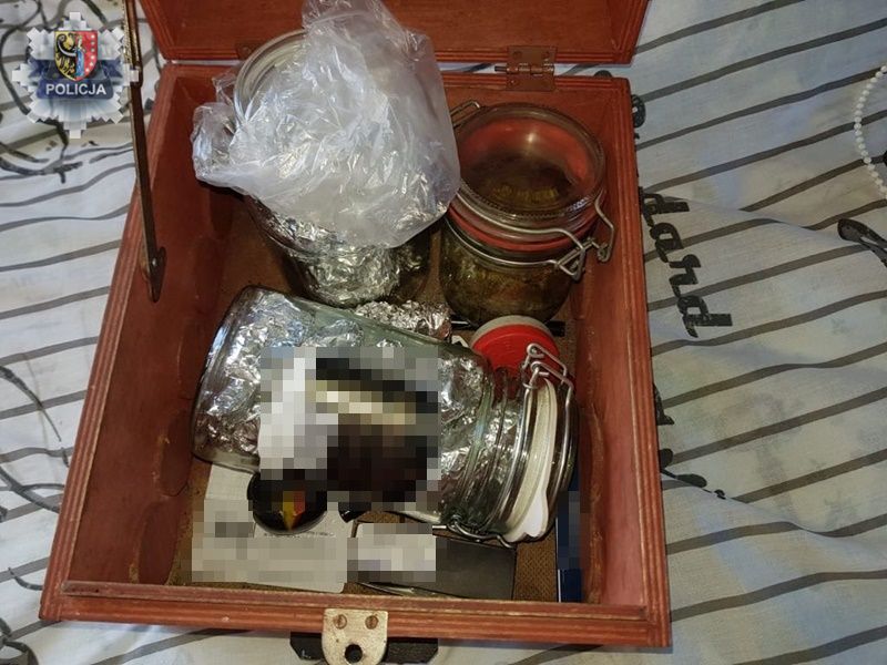 Podczas wykonywanych czynności funkcjonariusze znaleźli dziewięć wysuszonych łodyg konopi indyjskich i drewnianą skrzynię zabezpieczoną kłódką z kodem cyfrowym. W środku były trzy słoiki z suszem roślinnym. Przeszukując kolejne pomieszczenia mundurowi znaleźli jeszcze roślinę w doniczce i wagę elektroniczną.