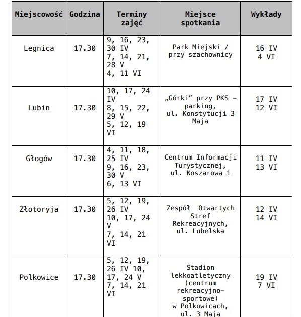 Poniżej przedstawiamy szczegółowy harmonogram zajęć w każdym mieście.