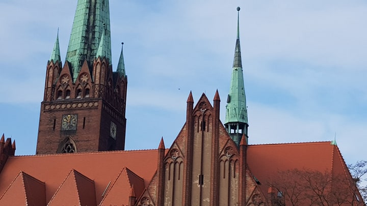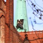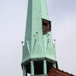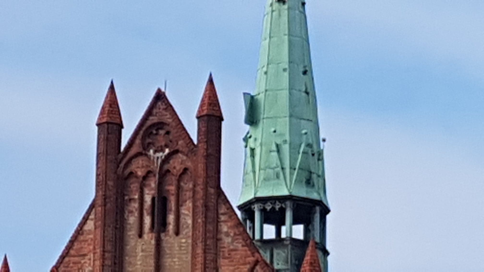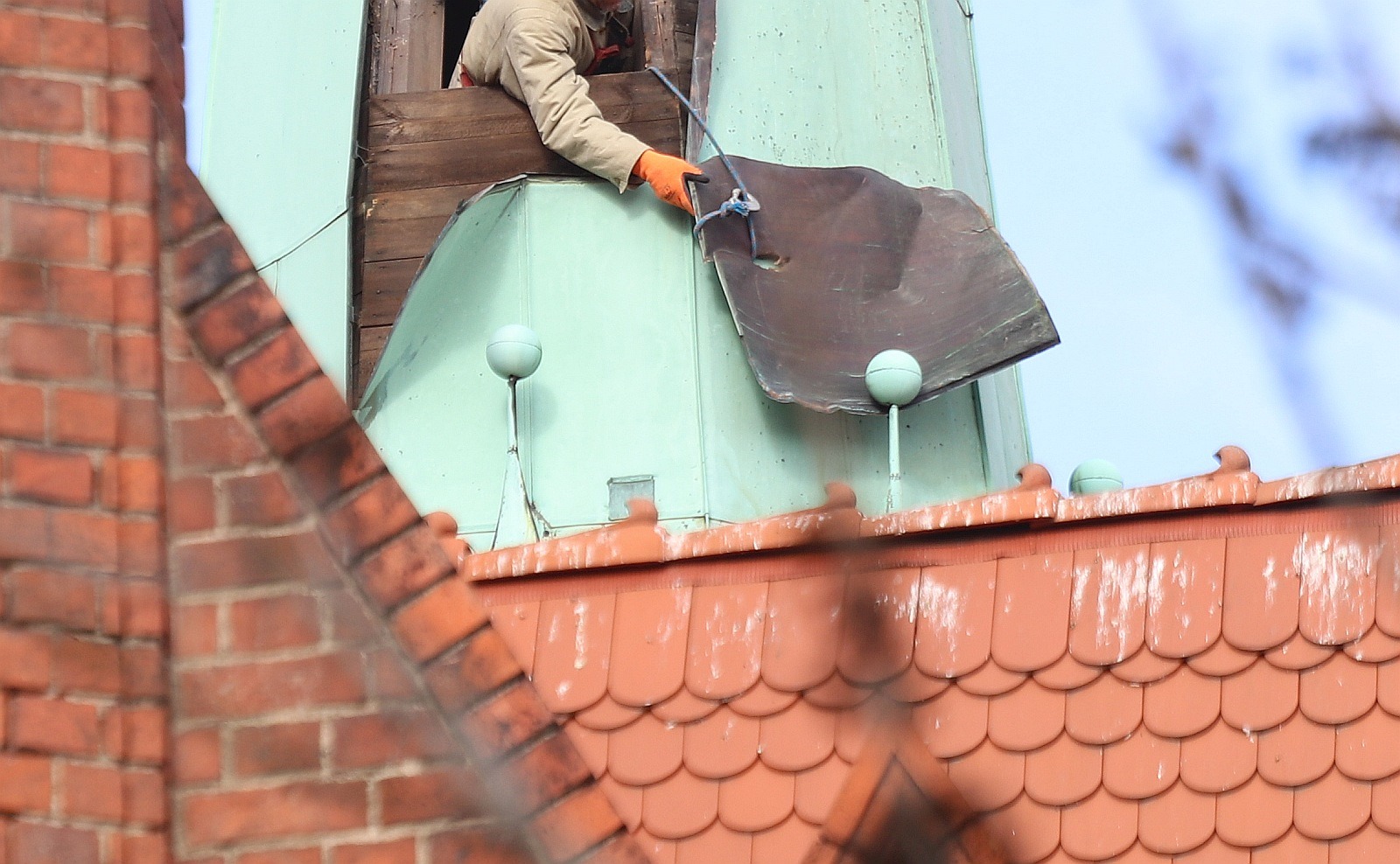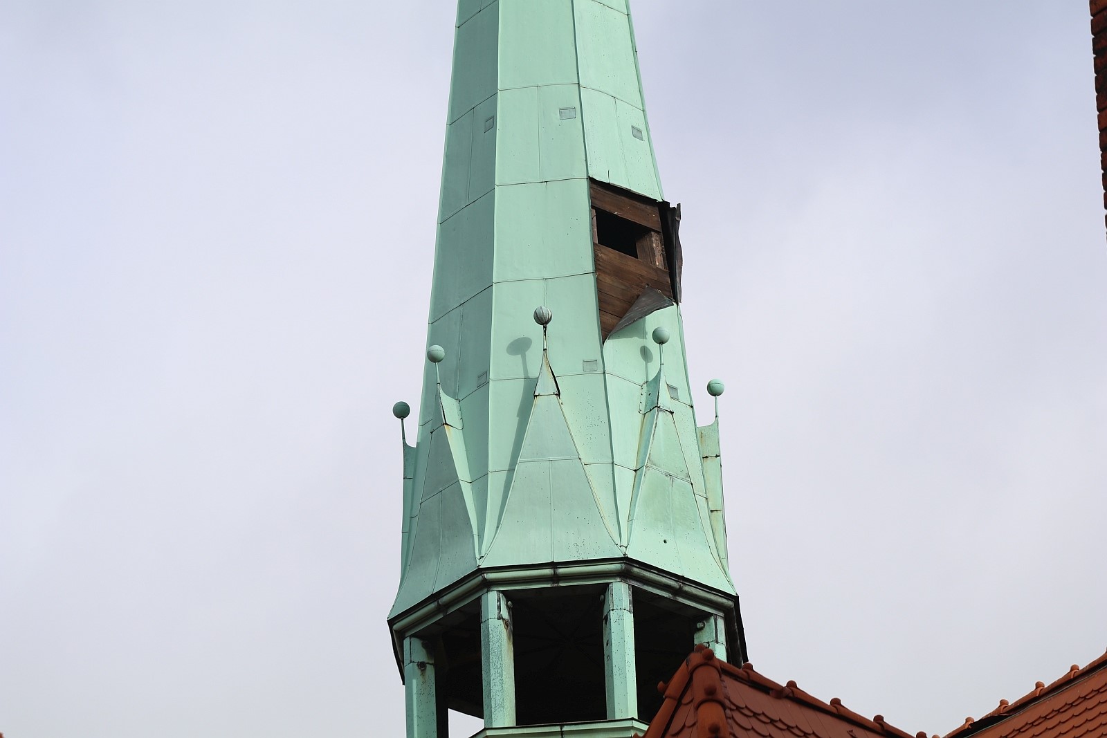 Porywisty wiatr oderwał część poszycia wieży sanktuarium pw. św. Jacka w Legnicy. Do uszkodzenia doszło już wczoraj, ale zbyt silny wiatr uniemożliwiał wcześniejszą interwencję służb.