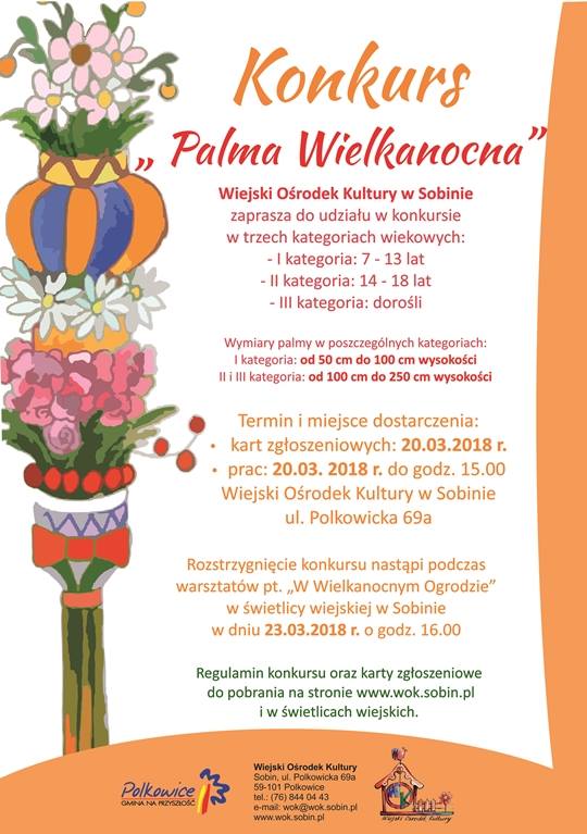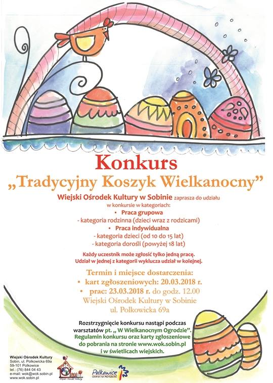 „Palma Wielkanocna”, „Tradycyjny Koszyk Wielkanocny” oraz „Baba Wielkanocna” – to trzy konkursy ogłoszone przez Wiejski Ośrodek Kultury w Sobinie dla mieszkańców gminy Polkowice.