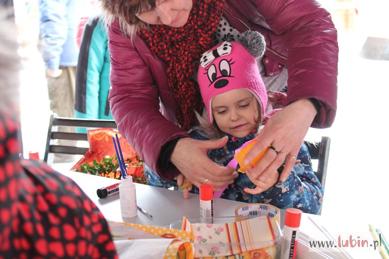 Lubinianie zaciekawieni jarmarkiem odwiedzają całymi rodzinami lubiński rynek. – Kupiłam ładny stroik na święta, a dziewczynki zrobiły palmę, która jutro poświęcimy – uśmiecha się pani Maria, która na jarmark przyszła z dwoma córeczkami.