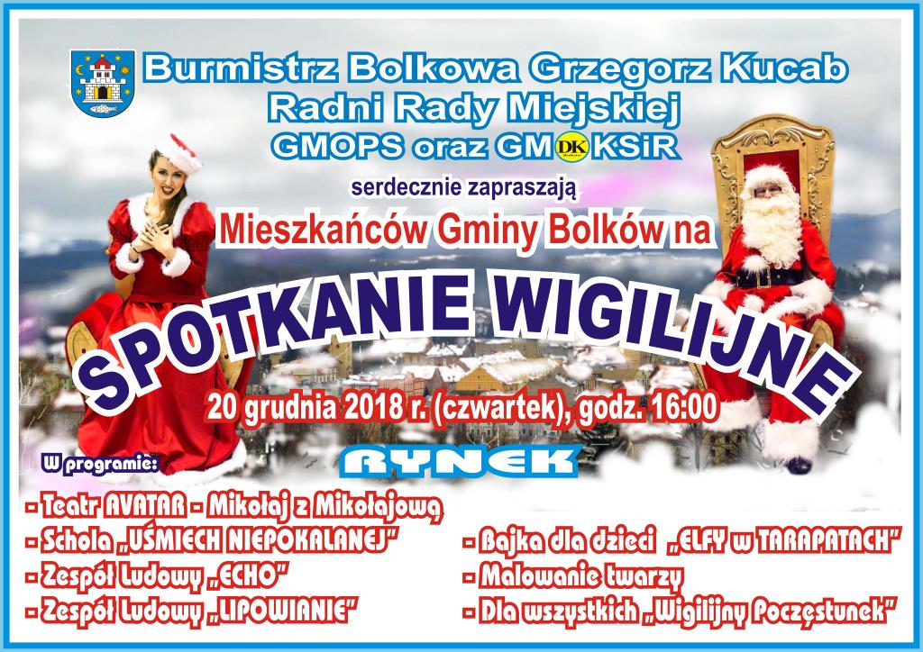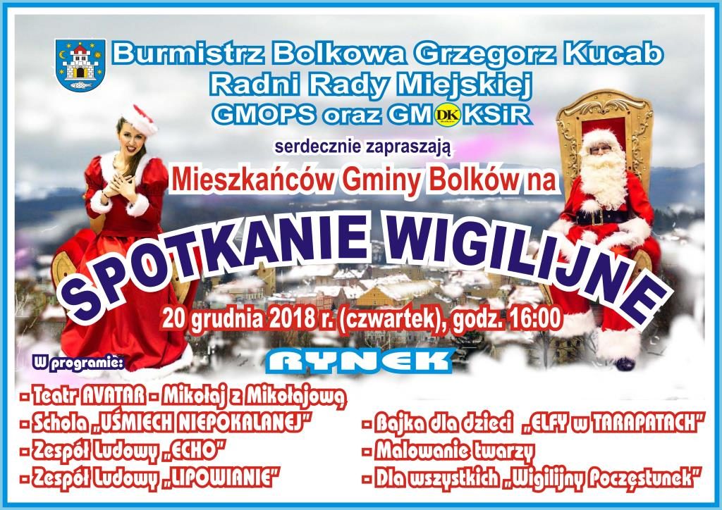 Na wigilijne spotkanie serdecznie zaprasza burmistrz Bolkowa Grzegorz Kucab, przedstawiciele rady miejskiej, Gminno- Miejski Ośrodek Pomocy Społecznej oraz Gminno-Miejski Ośrodek Kultury, Sportu i Rekreacji w Bolkowie.