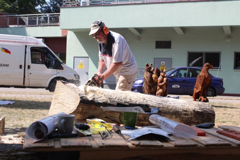 Inna rzeźba wyłoni się z kawałka drewna, nad którym pracuje Zdzisław Nowak z Męcinki. Przyjechał tu razem z żoną Danutą, która pomaga mu w pracy. – Co to będzie dokładnie, przekonamy się w niedzielę, ale zdradzę, że chciałbym zrobić totem – mówi rzeźbiarz.