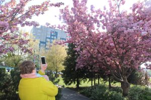 Jak widać, kwitnące wiśnie przyciągają mieszkańców, którzy z ciekawością przyglądają się pięknym kwiatom i robią zdjęcia.