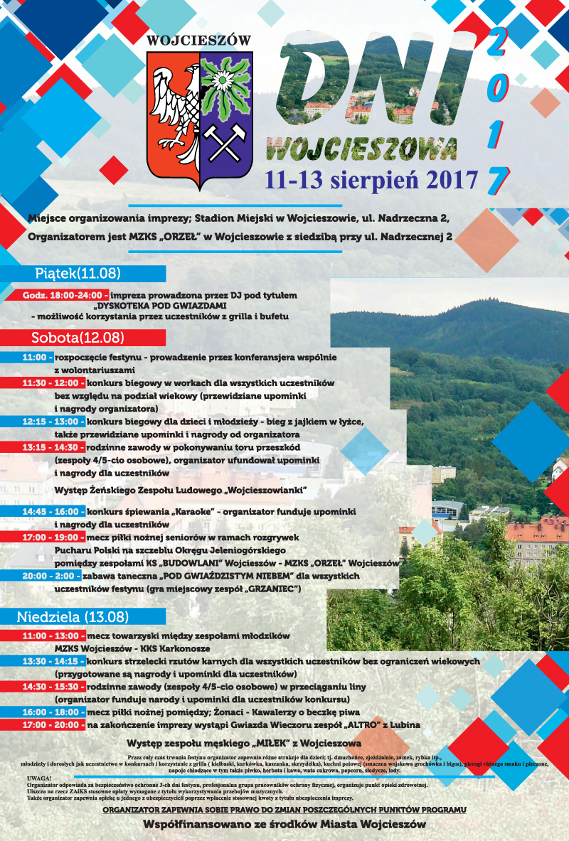 Organizatorem tegorocznych Dni Wojcieszowa jest miejscowy klub sportowy „Orzeł”, a miejscem imprez – stadion miejski przy ul. Nadrzecznej. Święto miasta rozpocznie się w piątek o godz. 18 „Dyskoteką pod Gwiazdami”. Uczestnicy zabawy będą mogli korzystać z grilla i bufetu.