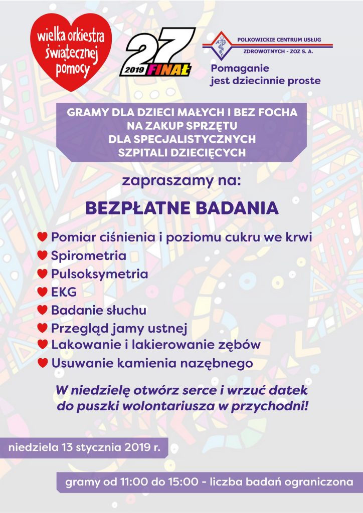 Tradycyjnie już Polkowickie Centrum Usług Zdrowotnych wesprze tegoroczny, 27. Finał Wielkiej Orkiestry Świątecznej Pomocy, w niedzielę, 13 stycznia.