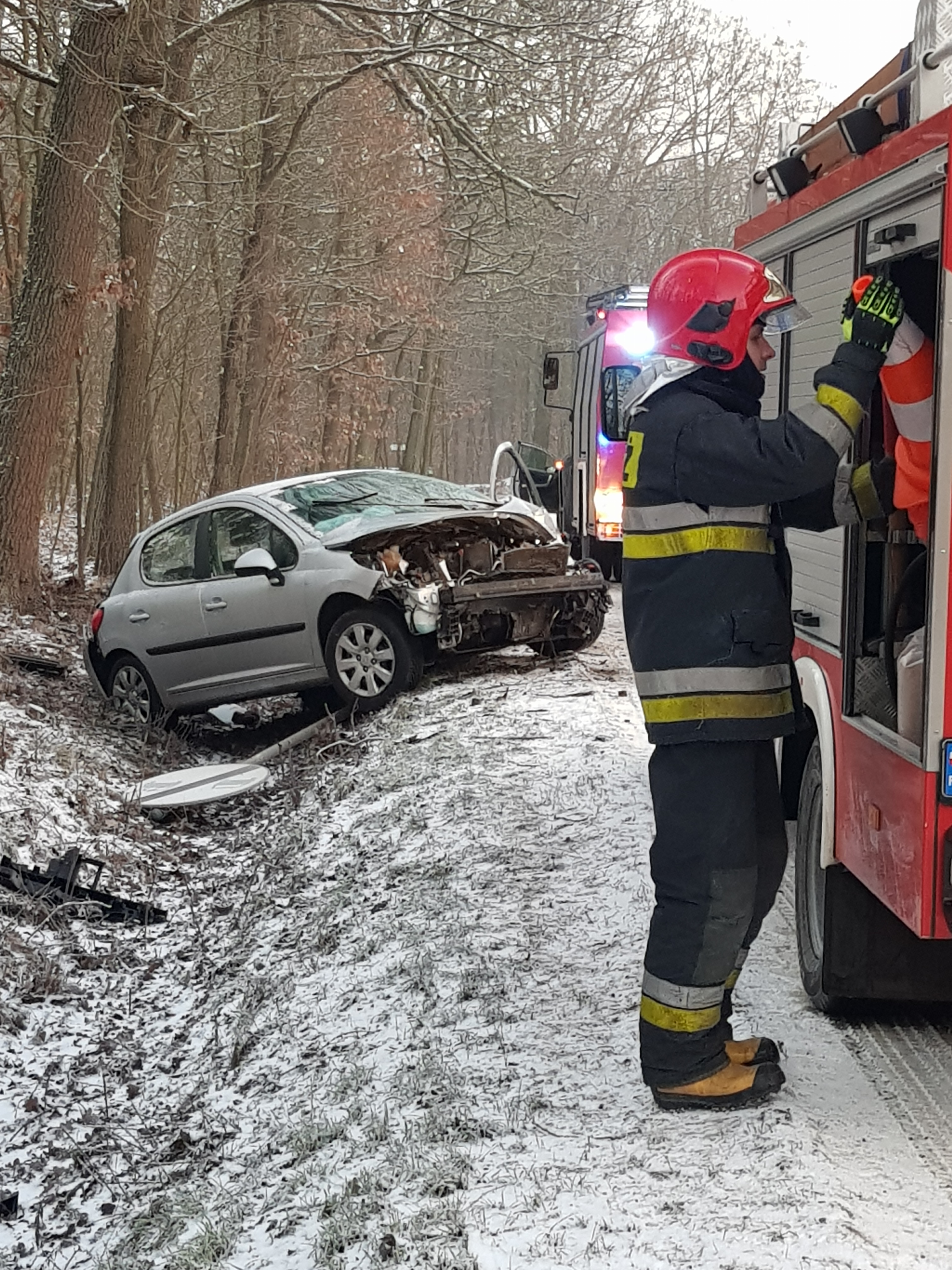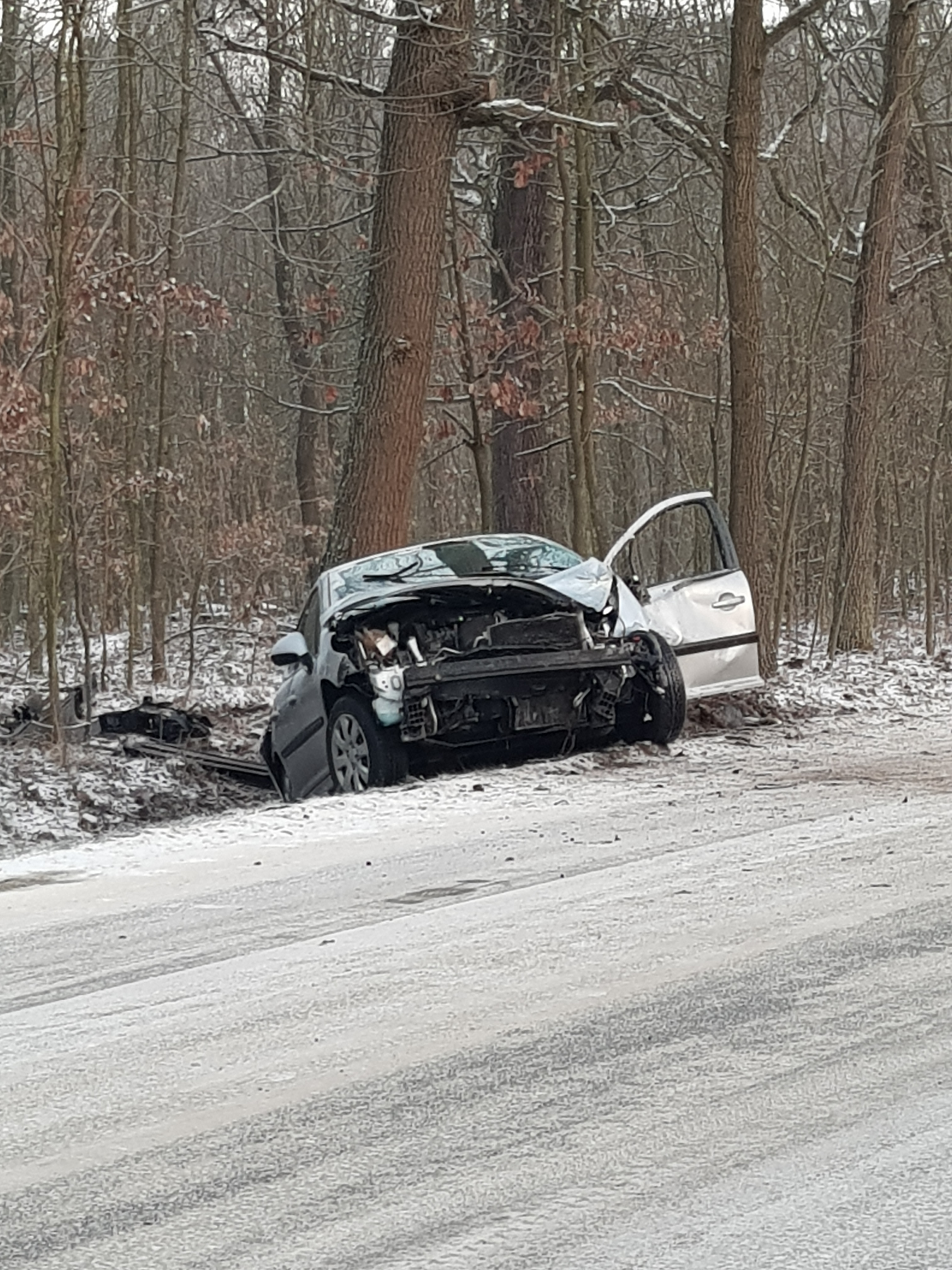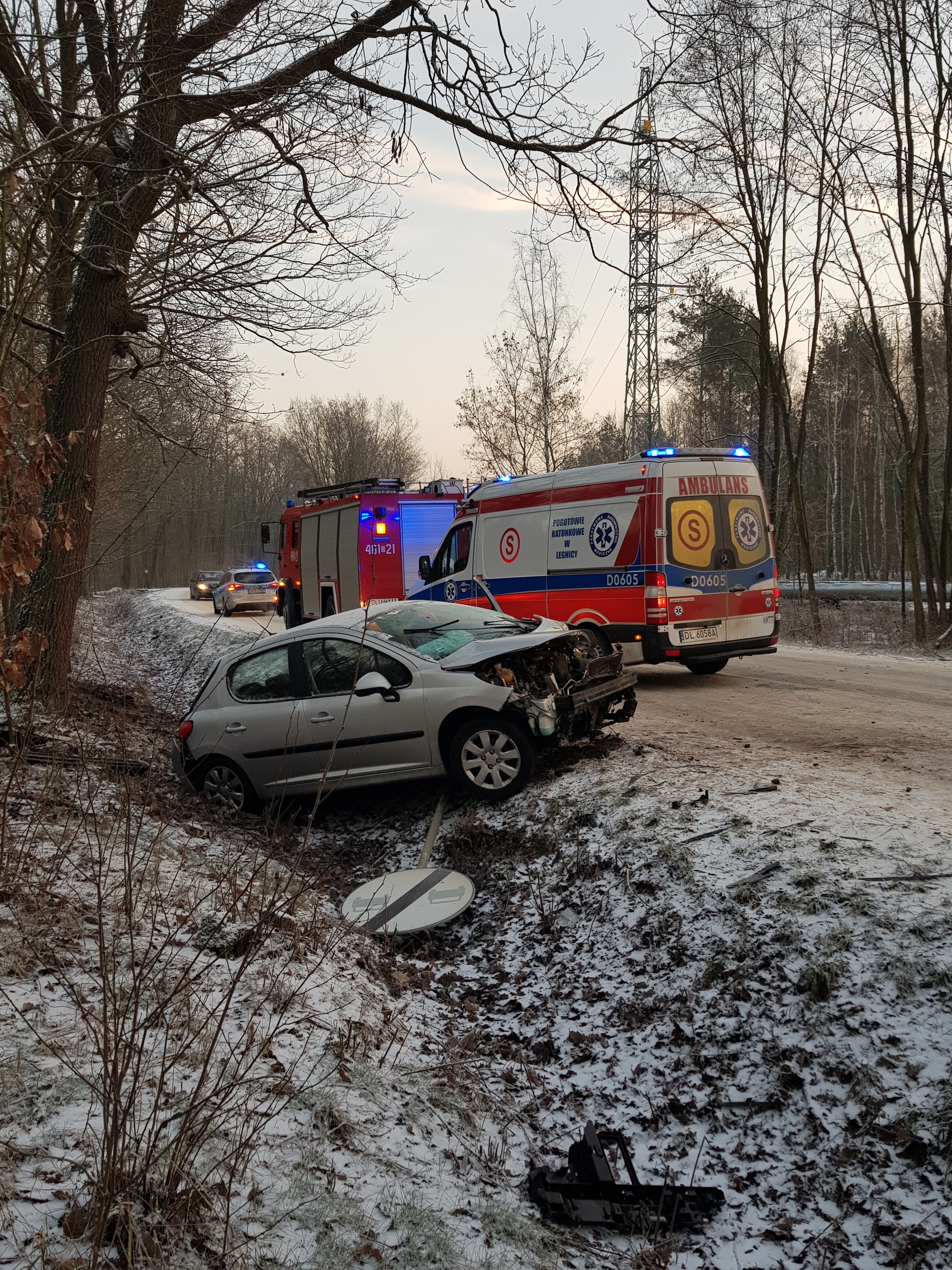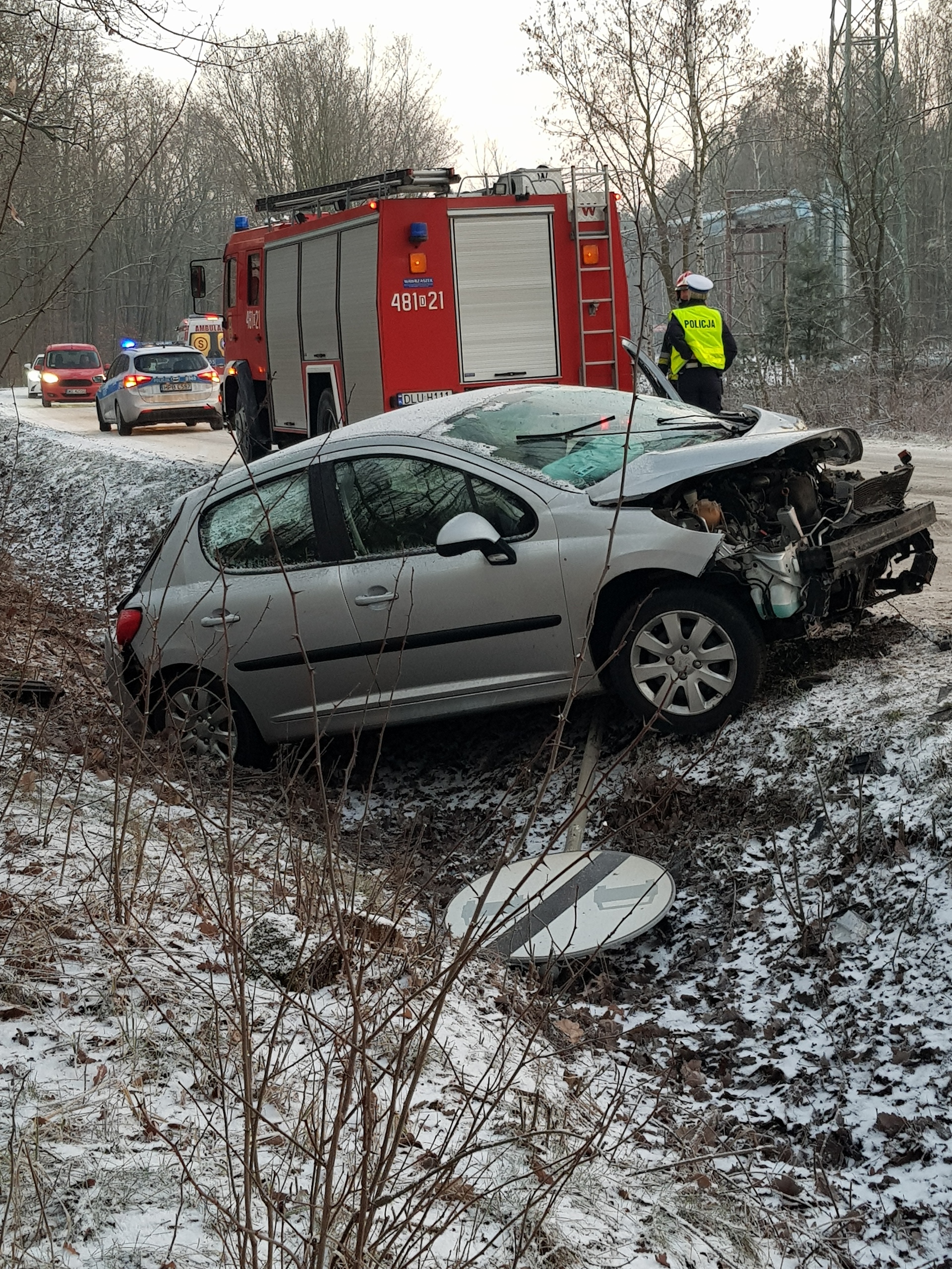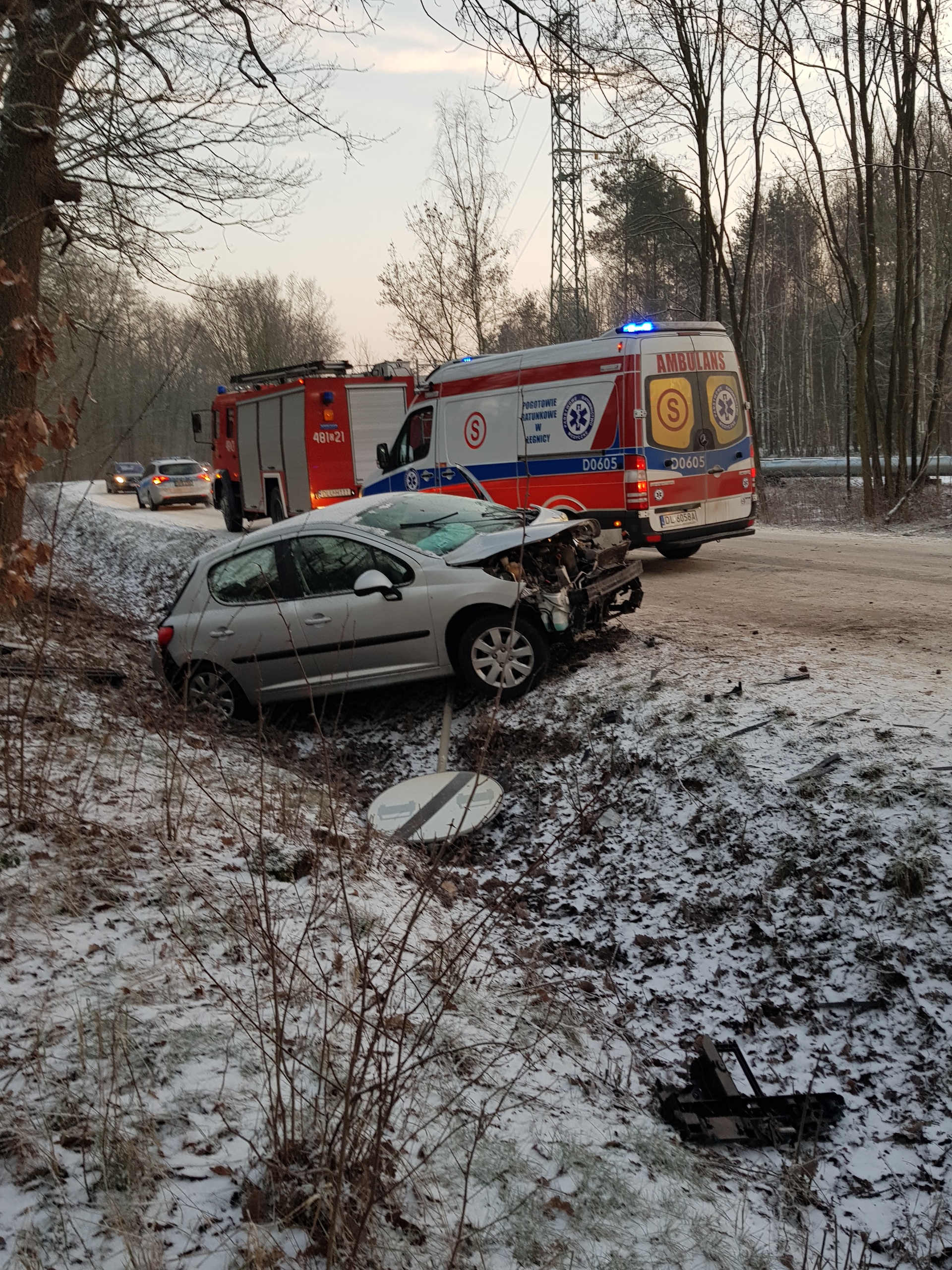Do zdarzenia doszło o 7 rano na prostym odcinku drogi z Rynarcic do Lubina. Kobieta jadąc do pracy wpadła w poślizg, wypadła z drogi, staranowała znak drogowy i wylądowała w rowie.