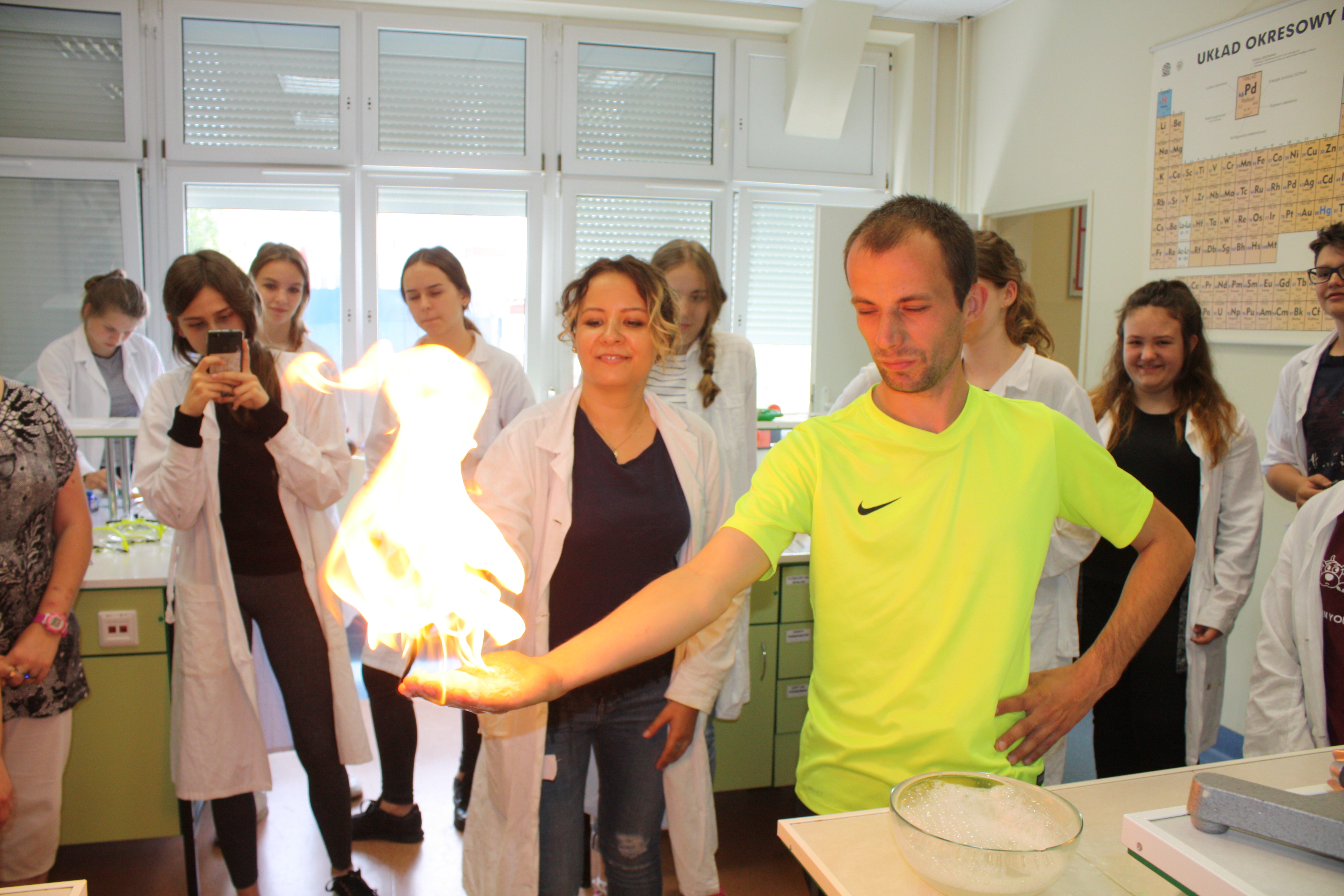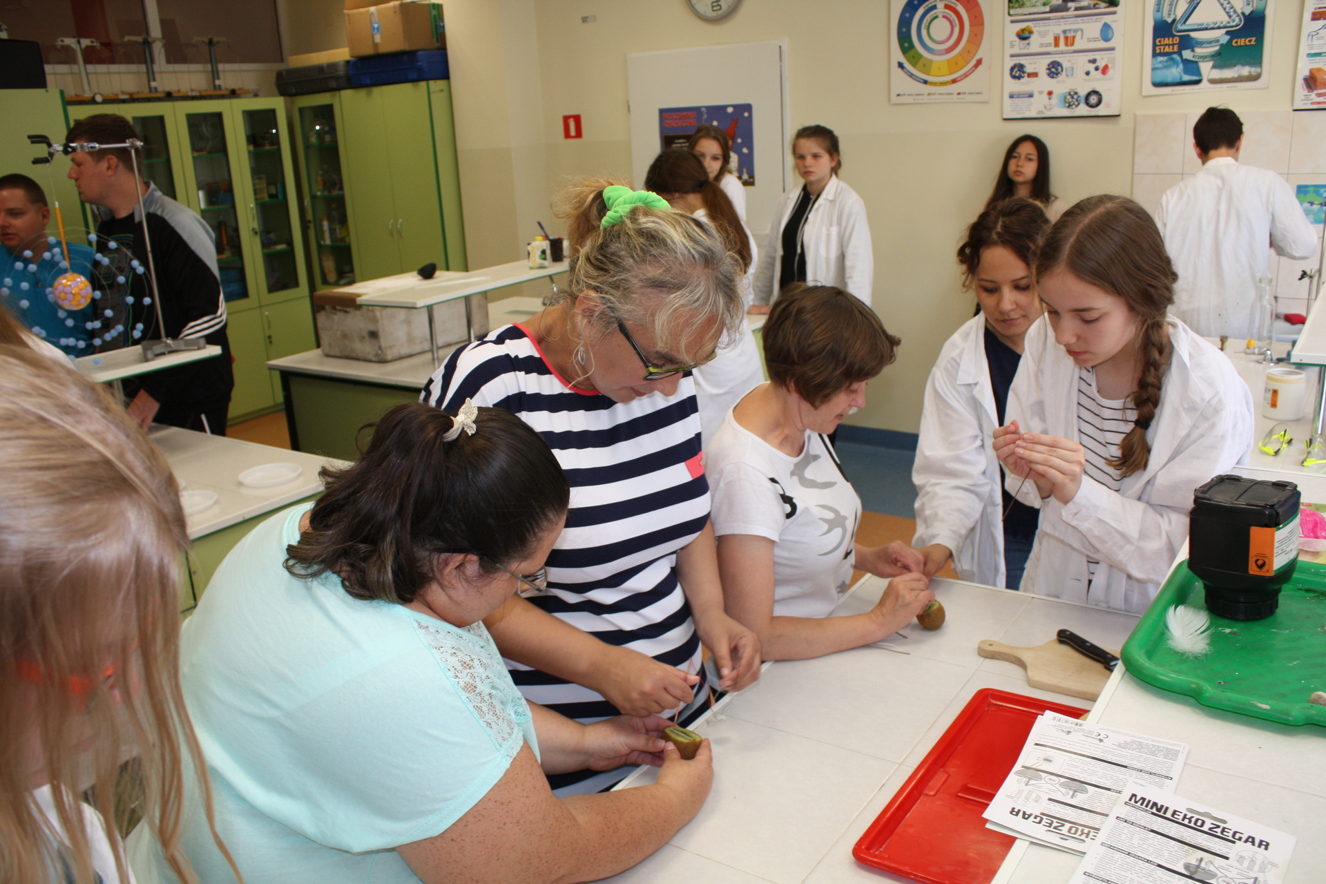 Podczas wizyty w gimnazjum uczestnicy WTZ mogli samodzielnie wykonać takie eksperymenty chemiczne, jak: otrzymywanie tlenu z drożdży, a także energii elektrycznej z owoców i warzyw, spalanie magnezu, zmiana barwy wskaźników pod wpływem kwasów i zasad. Dowiedzieli się jeszcze, czy można stworzyć obraz na mleku i zagotować wodę w temperaturze pokojowej. W laboratorium biologicznym zobaczyli pod mikroskopem świat grzybów i bakterii. Poznali budowę wewnętrzną człowieka i wykrywali skrobię w różnych produktach. Poza tym, razem z gimnazjalistami rozwiązali interaktywny test przyrodniczy przy użyciu i-padów, poznając przy okazji nowoczesną technologię komputerową.