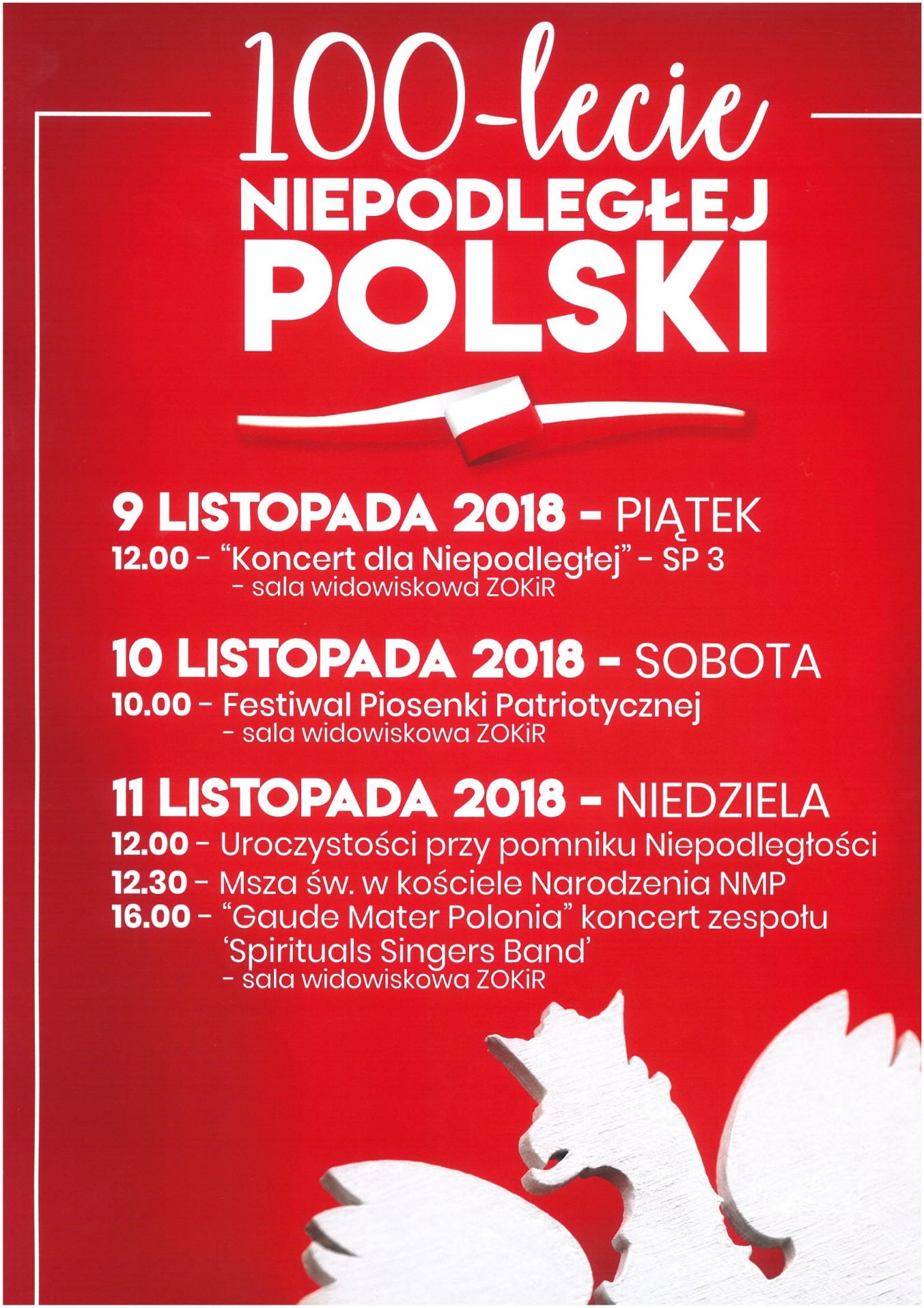 W Wojcieszowie uroczystości z okazji stulecia odzyskania Niepodległości rozpoczną się 11 listopada 2018 r. o godzinie 9.00 w Kościele Matki Bożej Królowej Polski w Wojcieszowie.