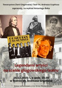„Legendarni artyści na scenie głogowskiego teatru” to temat wykładu z cyklu „Śladami kultury i historii ziemi głogowskiej”, na który zapraszają Towarzystwo Ziemi Głogowskiej i Teatr Miejski im. Andreasa Gryphiusa. Spotkanie odbędzie się w poniedziałek, 16 grudnia, o godz. 18.