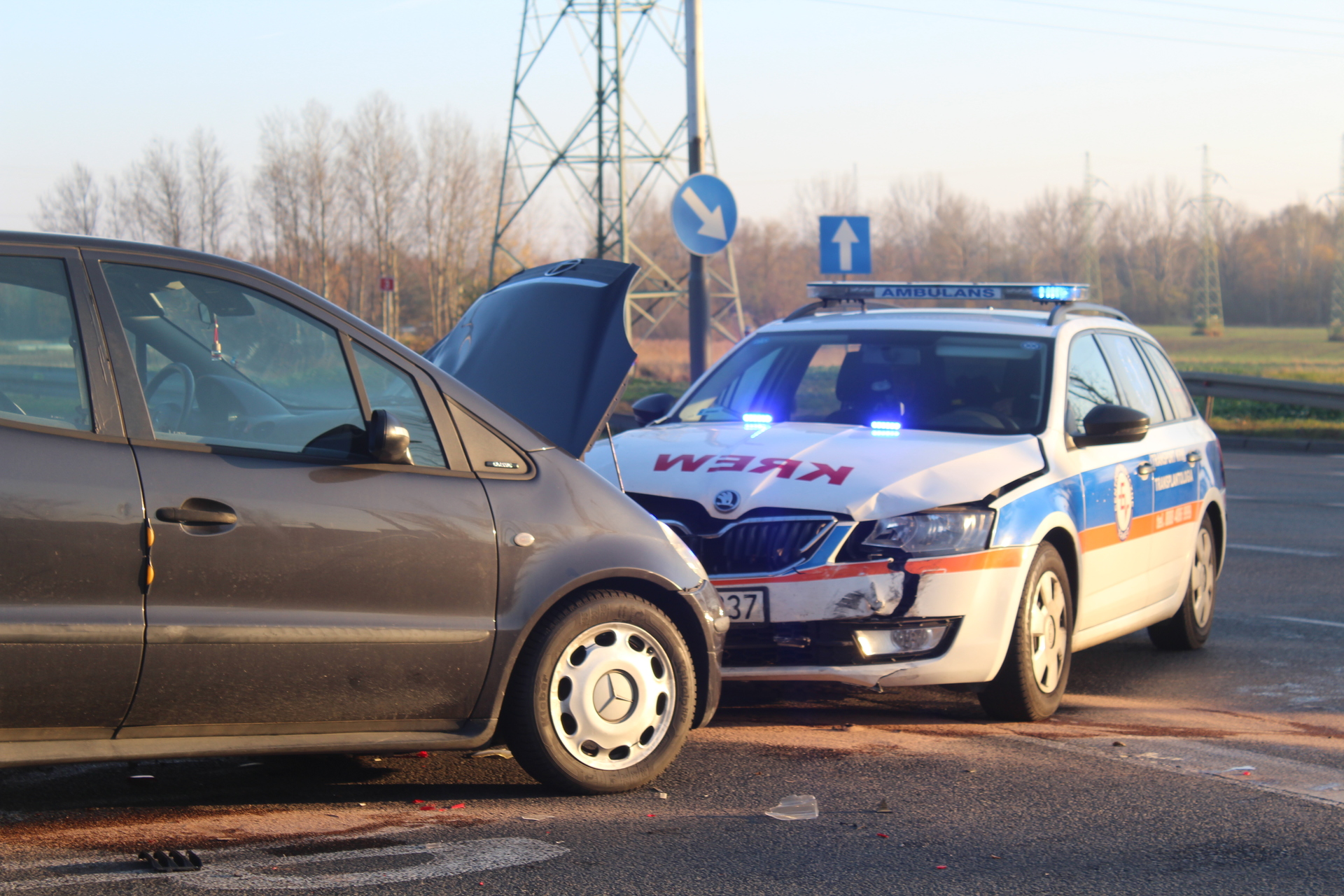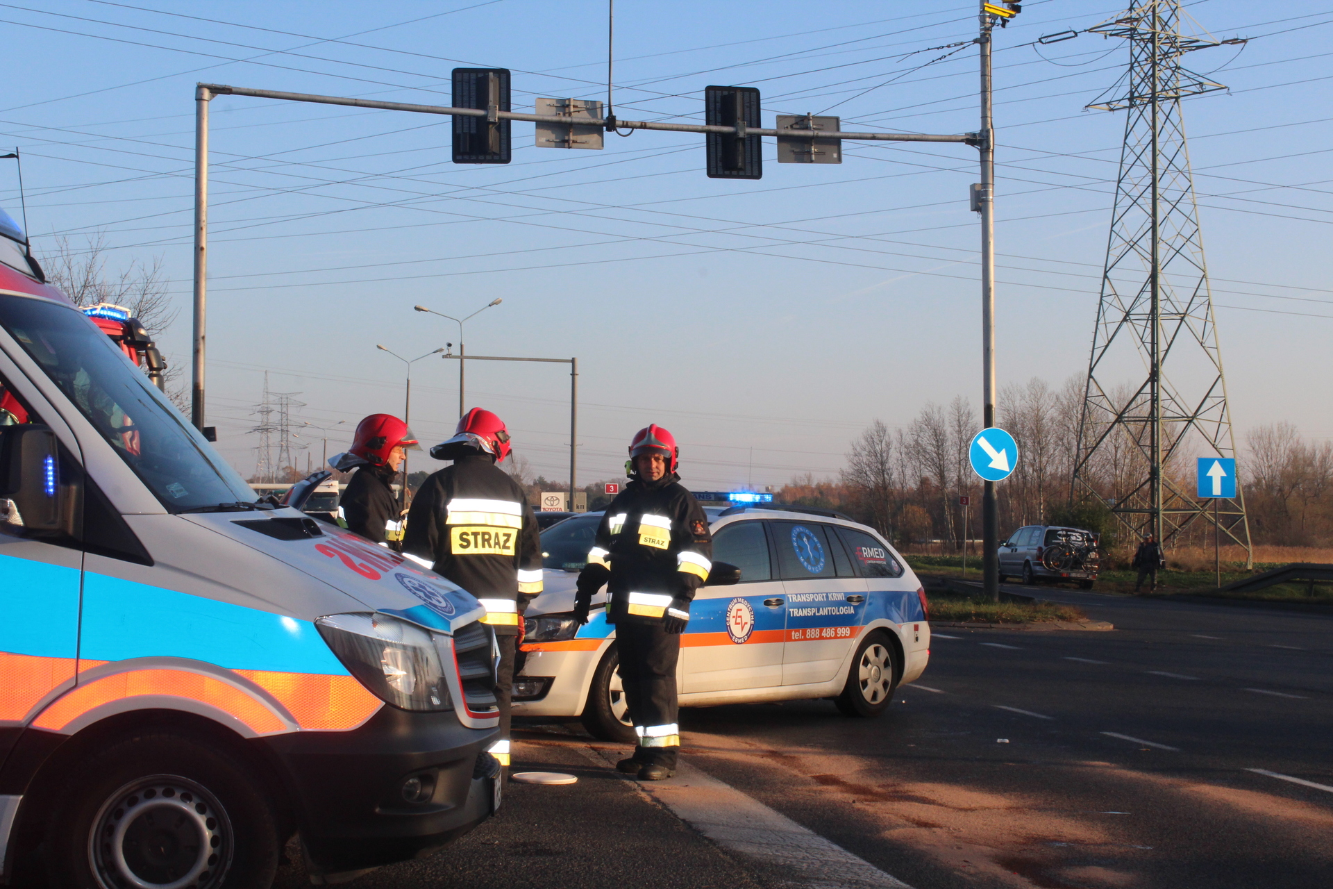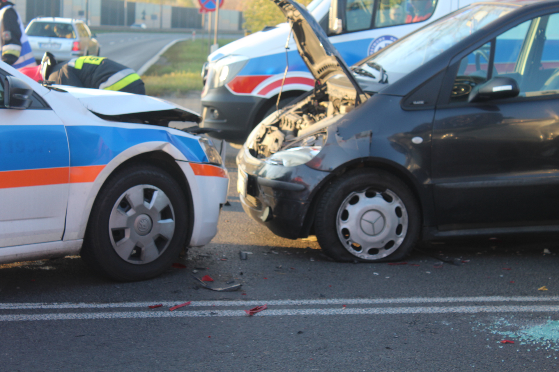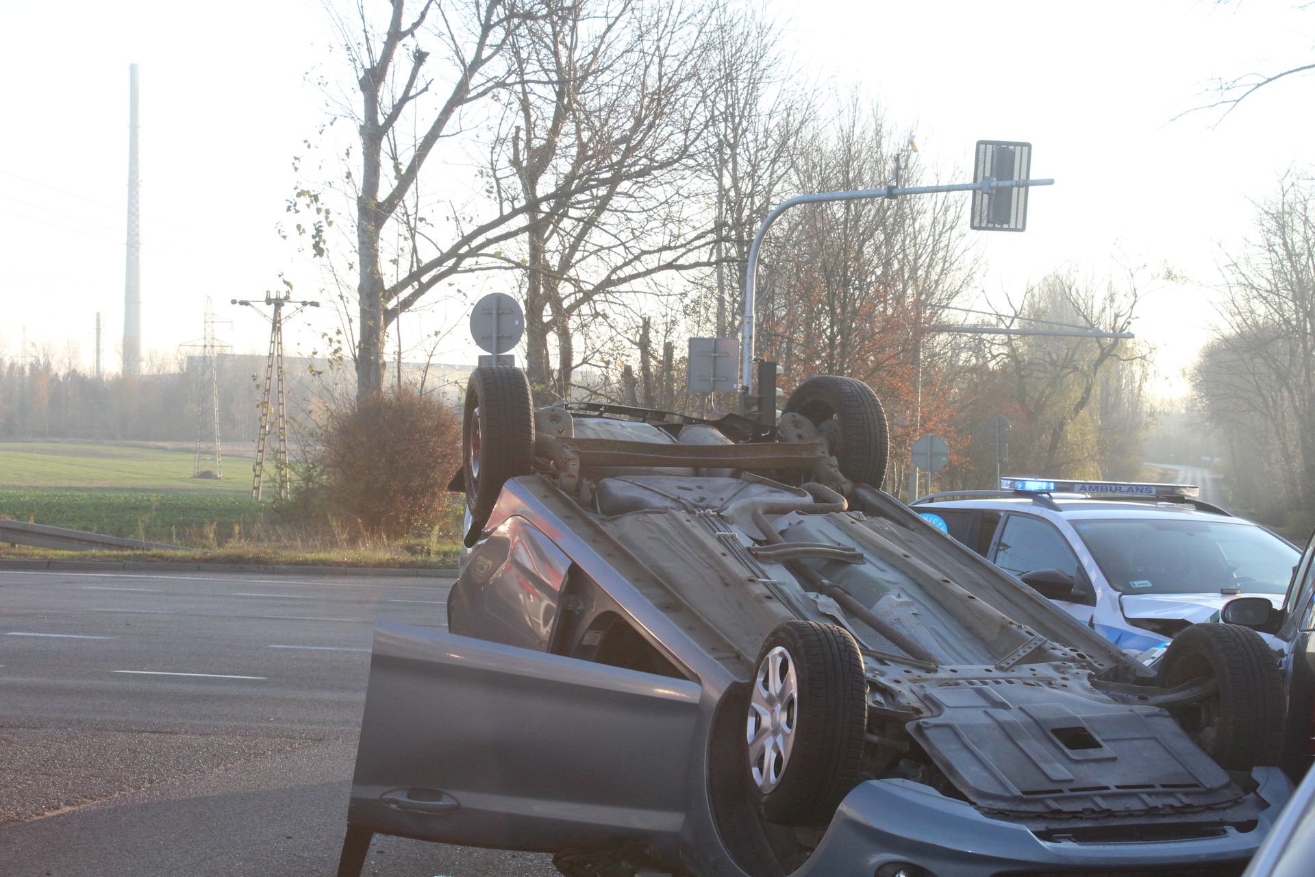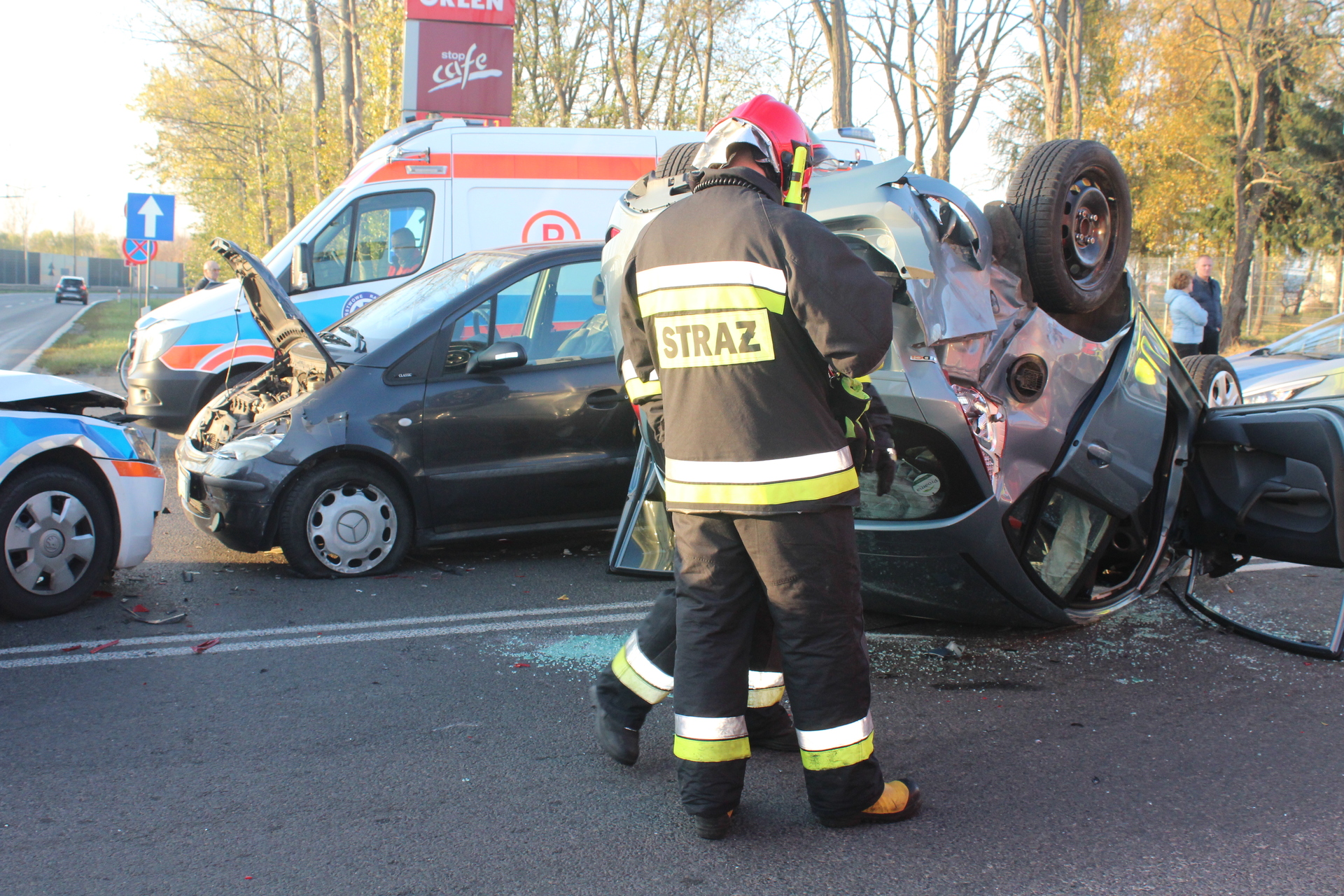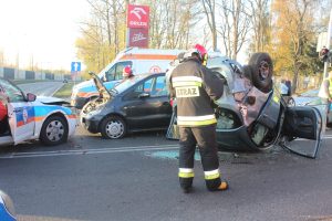 Jedna osoba została przewieziona do szpitala po zderzeniu z udziałem trzech samochodów na skrzyżowaniu krajowej „trójki” i ulicy Kopalnianej w Polkowicach. Jedno z aut dachowało.