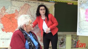 Po długiej i wyczerpującej podróży dotarła wraz z innymi do stacji Legnica. Dla wielu podróżnych Polaków ze wschodu była to jedyna ucieczka przed banderowcami i oddziałami ukraińskimi. W tym momencie prelegentka przerwała swoją opowieść. Zawsze wesoła, uśmiechnięta i znana z doskonałego humoru pani Genowefa miała łzy w oczach. – Nie, nie będę wracała do tych scen. Już to przeżyłam. Pamiętam, ale ten rozdział uważam za zamknięty – przerwała wspomnienia, a w sali lekcyjnej zapanowała kompletna cisza, co ponoć w przypadku klasy ósmej rzadko się zdarza. Refleksja nad prześladowaniami nie trwała długo. Pani Kunecka w swoim stylu ożywiła słuchaczy opowieściami o pierwszych dniach po osiedleniu się w Hermannsdorfie (dawna nazwa Męcinki – przyp. red.). Szczegółowo przedstawiła powstawanie w gminie gospodarstw rolnych, spółdzielni, poczty, sklepów i pierwszych kół artystycznych, często padały znajome dla dzieci nazwiska ich babć i dziadków. Opowieści towarzyszyła prezentacja zdjęć pn. Powrót do ojczyzny, przygotowana przez historyczkę, Iwonę Torończak-Kaczor. Był też czas na zadawanie pytań.