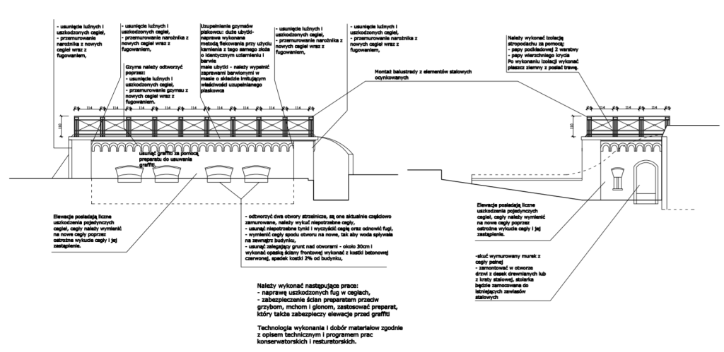 Gmina miejska otrzymała też pozwolenie na wykonanie prac konserwatorskich i restauratorskich. Będą one polegały m.in. na naprawie uszkodzonych narożników i uzupełnieniu ubytków cegieł muru oporowego. Odtworzony zostanie gzyms arkadowy ściany wschodniej i północnej budynku, a uzupełniony – kamienny gzyms wieńczący budynek. Ponadto, odtworzone zostaną dwa otwory strzelnicze ściany frontowej.