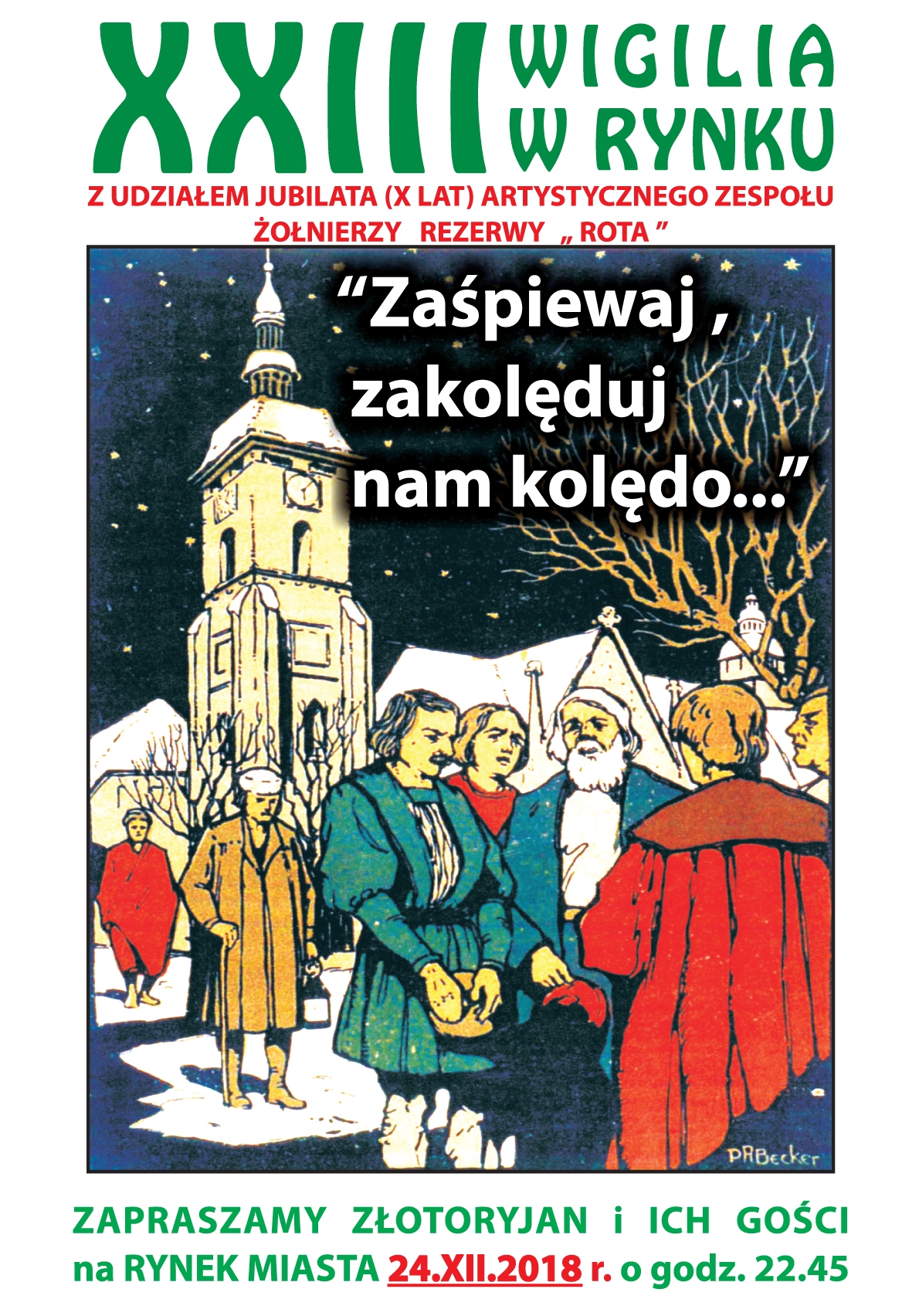Później na scenie pojawi się Zespół Artystyczny Żołnierzy Rezerwy Rota, który w tym roku obchodzi 10. urodziny. W przerwach pomiędzy koncertami będzie miał miejsce ceremoniał wigilijny, czyli odczytanie Ewangelii, przypomnienie tradycji Wigilii w Rynku, poświęcenie opłatka. W uroczystości wezmą udział księża z trzech złotoryjskich parafii, władze miasta i Polskie Bractwo Kopaczy Złota. A pochodniami oświetlą Rynek harcerze.