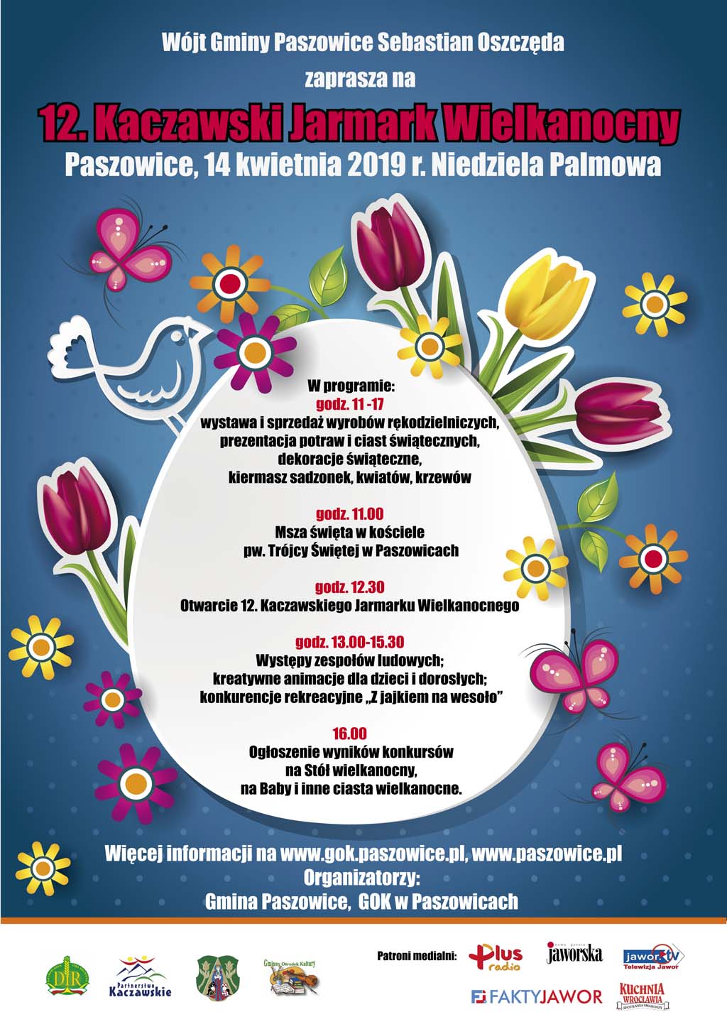 Wójt gminy Paszowice Sebastian Oszczęda zaprasza w niedzielę, 14 kwietnia do odwiedzenia 12. Kaczawskiego Jarmarku Wielkanocnego. Po Święcie Pierogów to drugie wydarzenie na terenie gminy, które przyciąga zarówno sporo wystawców jak i zainteresowanych kupujących.