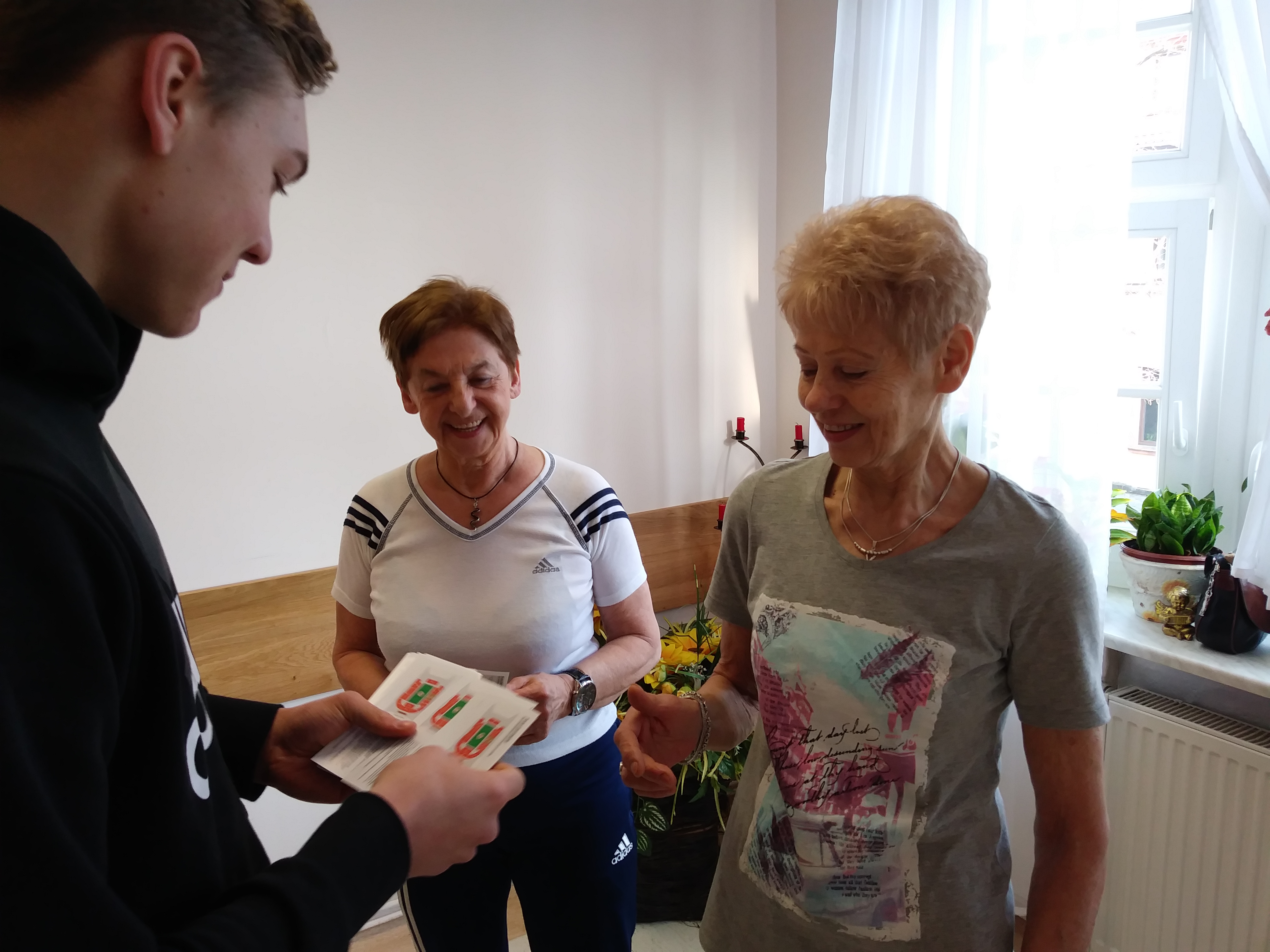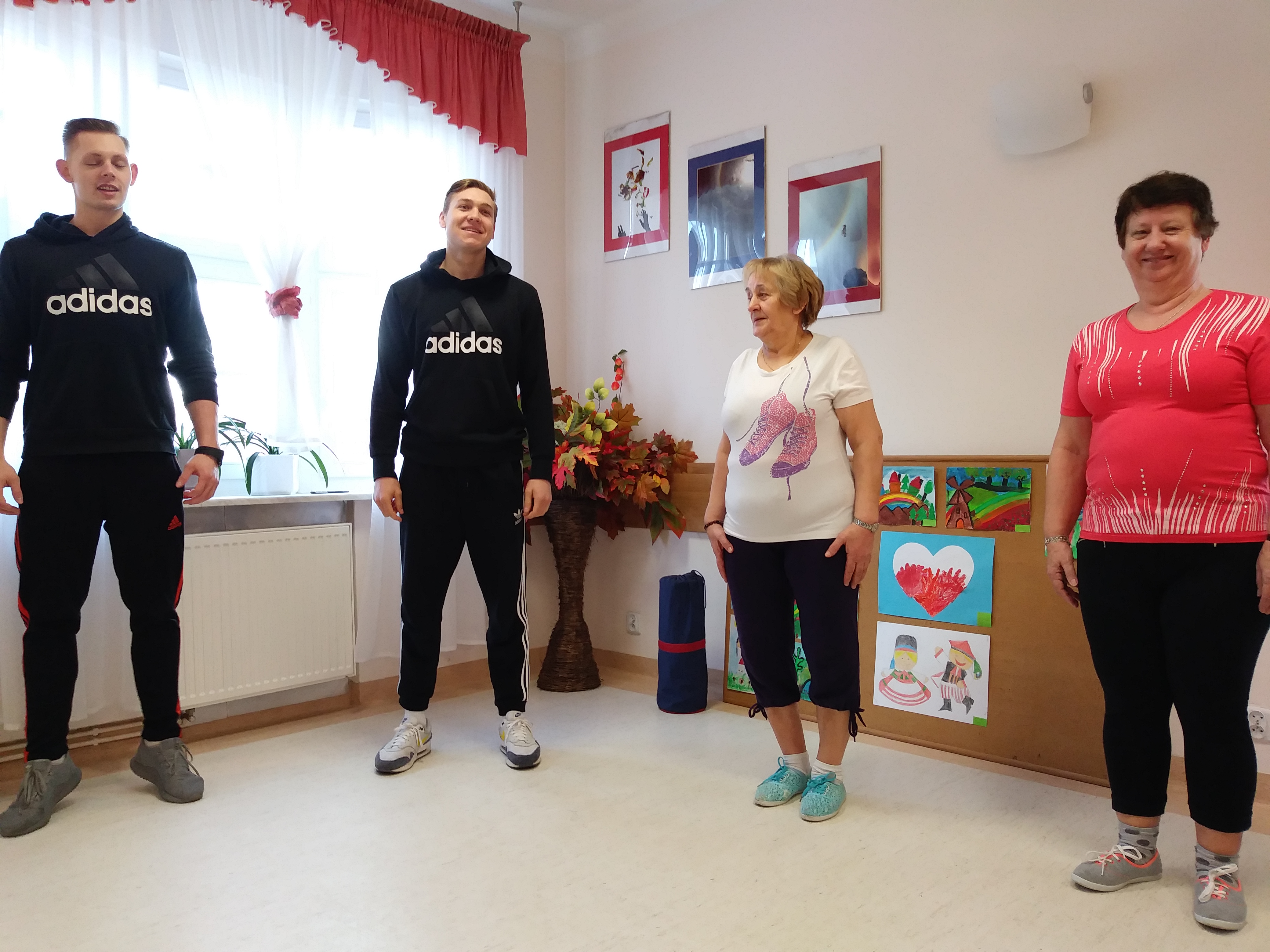 W Domu Seniora gościli dziś dwaj szczypiorniści Zagłębia Lubin. Maciej Tokaj i Mikołaj Borowczyk najpierw pojawili się na próbie zespołu ludowego, działającego przy Domu Dziennego Pobytu Senior, a następnie poprowadzili poranną gimnastykę dla seniorek.