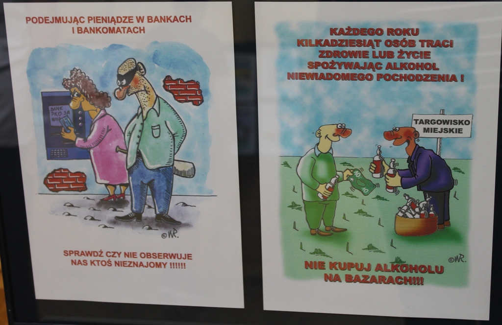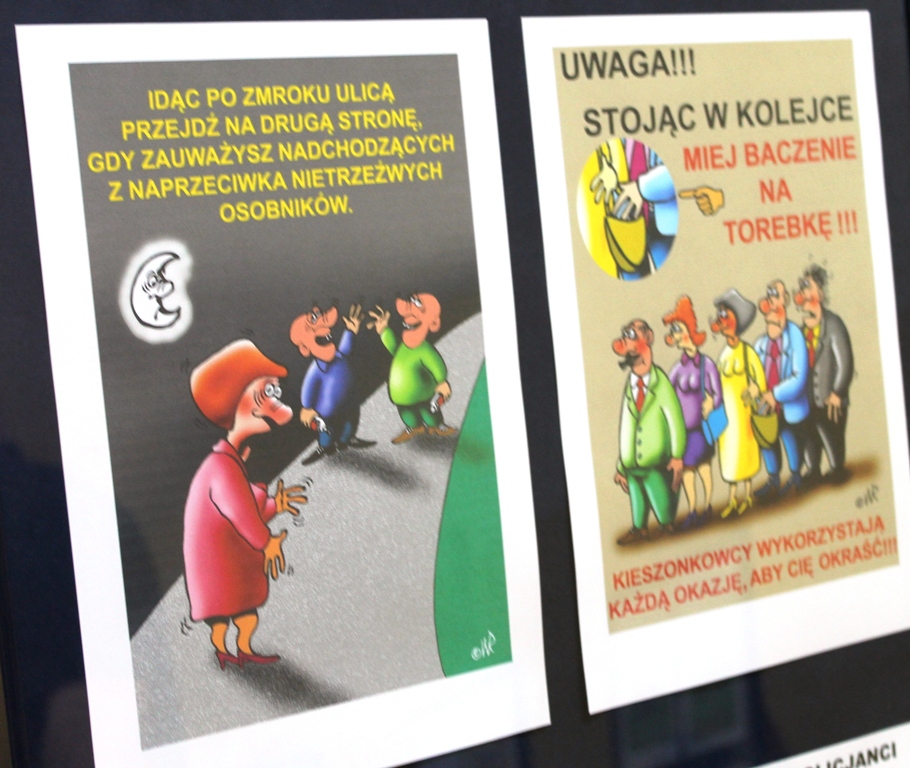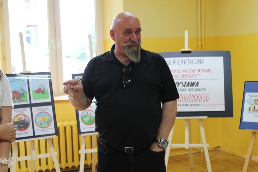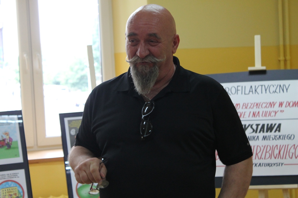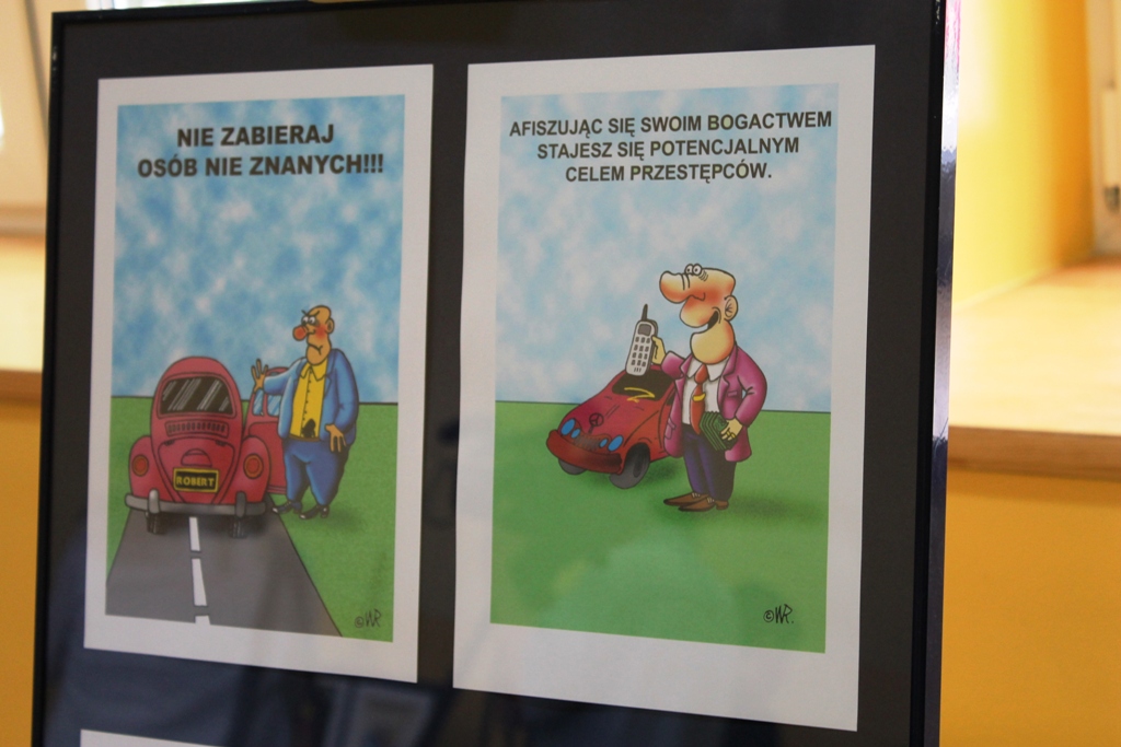 Zamiast nudnych pogadanek o niebezpieczeństwach, jakie czyhają na człowieka w windzie, pod bankomatem czy na ulicy – uczniowie legnickiej podstawówki zobaczyli wystawę rysunków mających ich ustrzec przed nieszczęściem. Autorem prac jest doskonale znany strażnik miejski – rodowity chojnowianin, karykaturzysta i radny powiatu legnickiego Robert Wierzbicki.