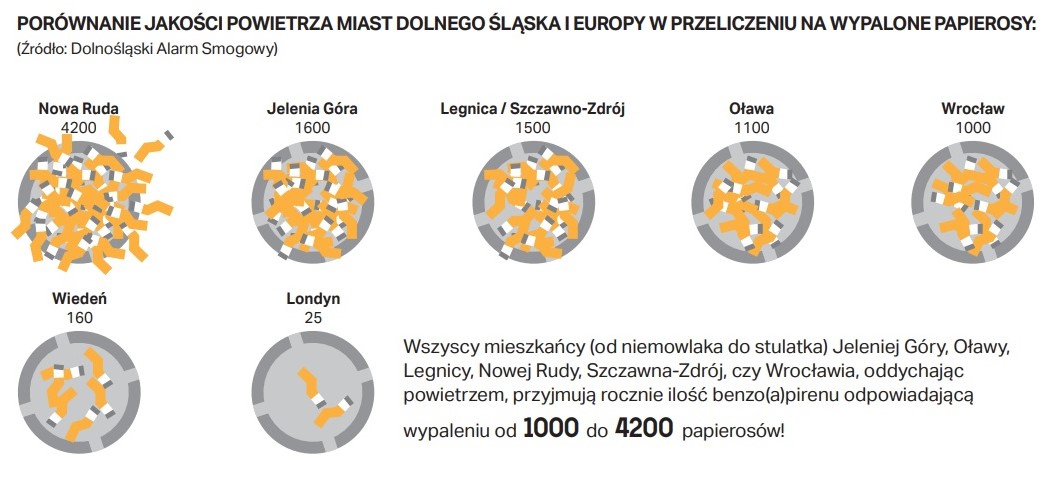 Aktywiści szkodliwość oddychania mocno zanieczyszczonym powietrzem porównują do wdychania dymu papierosowego. – Przeliczamy zanieczyszczenie powietrza w naszych miastach na wypalone papierosy, dlatego, że benzo(a)piren, rakotwórczy związek, który znajduje się w smogu, znajduje się też w papierosach – mówi Radosław Gawlik z Dolnośląskiego Alarmu Smogowego.