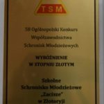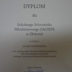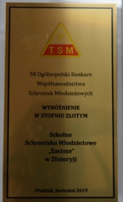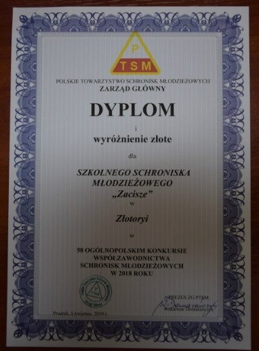 Szkolne Schronisko Młodzieżowe „Zacisze” w Złotoryi drugi raz z rzędu zdobyło najwyższe Złote Wyróżnienie w Ogólnopolskim Konkursie Współzawodnictwa Schronisk Młodzieżowych. Konkurs, którego organizatorem jest Polskie Towarzystwo Schronisk Młodzieżowych, odbył się już po raz 58. Nagrody zostały wręczone podczas uroczystej gali w Prudniku.