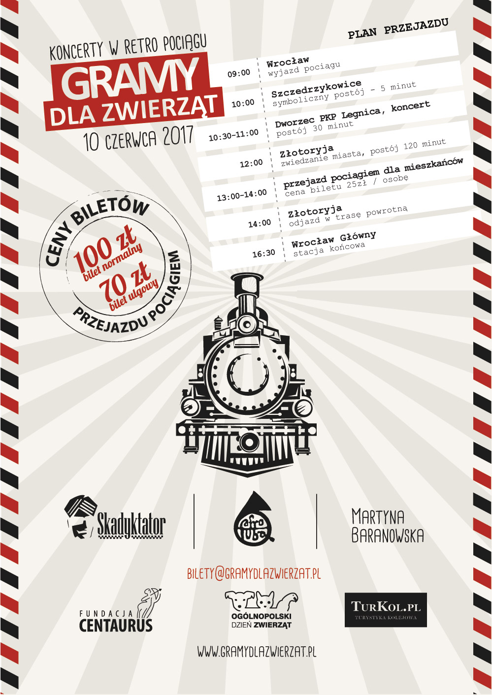 Akcja ma przede wszystkim na celu pomoc chorym zwierzętom, a zwłaszcza koniom.Inicjatorem jest Fundacja Centaurus, która we współpracy z TurKol.pl zorganizowała przejazd zabytkową lokomotywą „Skarb” ze stolicy Dolnego Śląska do Złotoryi. Pociąg wyruszy ok. 9.00, a do złotego grodu powinien dotrzeć ok. 12.30. Po drodze na kilka minut zatrzyma się w Szczedrzykowicach, gdzie znajduje się największy ośrodek fundacji, w którym schronienie znalazło ponad 400 zwierząt.