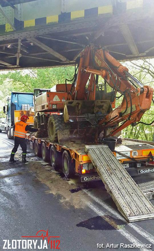 Przejeżdżając pod wiaduktem pojazd uderzył w konstrukcję stalową, w wyniku czego w koparce uszkodzone zostały węże hydrauliczne, z których na jezdnię i naczepę wyciekła duża ilość oleju hydraulicznego.