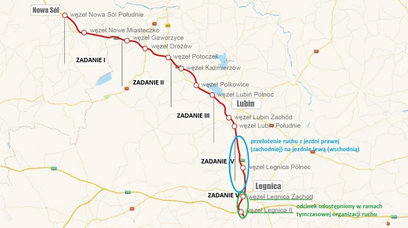 Natomiast na pozostałym 15-kilometrowym odcinku, który zaczyna się tuż za Chróstnikiem i kończy przy węźle Legnica Zachód, ruch pojazdów został przełożony z jezdni prawej (zachodniej) na jezdnie lewą (wschodnią). Widać to również poniżej na załączonej mapce i zdjęciach. Zmiana ta umożliwi wykonawcom prowadzenie kolejnych prac przy budowie drogi ekspresowej S3.