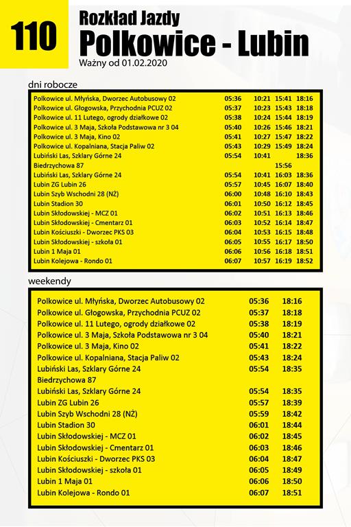 – Reorganizacja rozkładów jazdy linii nr 110 podyktowana jest ostatnimi zmianami wprowadzonymi w rozkładach jazdy kolei – wyjaśnia Jan Wojtowicz, pełnomocnik burmistrza Polkowic ds. górnictwa i komunikacji. – Jednym z priorytetów przy tworzeniu bezpłatnego połączenia Polkowic z Lubinem było jego skorelowanie z odjazdami pociągów z dworca kolejowego w Lubinie. Ostatecznie, zmiany w rozkładzie linii są niewielkie, ale dzięki temu bez problemu zdążymy przesiąść się w Lubinie do pociągu i wyruszyć w dalszą podróż – dodaje.