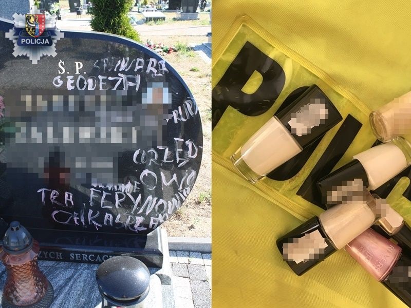 Do zdarzenia doszło na początku lipca, tuż po południu, na cmentarzu komunalnym przy ul. Spokojnej. Sprawca za pomocą farby i lakierów do paznokci zdewastował pięć grobów. Na płytach nagrobnych pojawiły się różne treści i znaki. Policjanci szybko ustalili i zatrzymali kobietę podejrzewaną o ten czyn. To 55-letnia mieszkanka miasta.