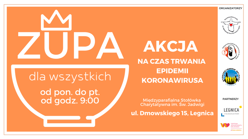Ruszyła akcja Zupa w Koronie dla Wszystkich. Dzięki zaangażowaniu wolontariuszy każdy potrzebujący ma możliwość spożycia ciepłego posiłku. Zupę można otrzymać w Międzyparafialnej Stołówce Charytatywnej im. św. Jadwigi przy ul. Dmowskiego 15 w Legnicy.